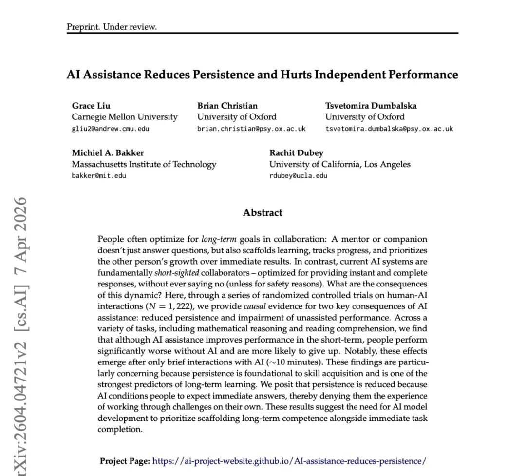近日,来自卡内基梅隆大学、牛津大学、MIT 及加州大学洛杉矶分校的联合团队发布了一篇最新研究成果,通过迄今最大规模的随机对照实验提供因果证据:使用AI辅助解题,不仅让人独立解题能力下滑,还会让人更快放弃思考。研究团队招募 1222 名参与者,分为「有 AI 辅助」与「全程独立」两组,分别完成分数计算和阅读理解任务。在最终撤走 AI 的独立测试环节,AI 辅助组的答题正确率显著低于对照组(实验一:0.57 vs 0.73)。更关键的是,他们直接放弃作答的比例也明显更高。这意味着 AI 的影响不只是「做不对」,而是「不想做了」——动力本身被侵蚀了。研究进一步拆解了 AI 的使用方式:61% 的参与者选择直接向 AI 索要答案,这部分人的测试成绩在所有组别中垫底,且相比自身实验前的水平出现了明显退步;而那些只向 AI 要提示、自己推导答案的参与者,则几乎未受负面影响。换句话说,「让 AI 替你想」和「让 AI 帮你想」,结果截然不同。上述效应仅需约 10 至 15 分钟的 AI 交互即可产生。研究者给出了两个解释:一是「参照点偏移」:习惯了 AI 秒出答案后,独立思考会感觉「反常地费力」,触发放弃冲动,且这一机制会自我强化;二是「自我认知剥夺」:人只有在独立克服困难的过程中,才能建立对自身能力的准确判断,AI 把这个过程全部跳过,导致人既不积累经验,也不敢相信自己能做到。论文明确指出,这不是「别用 AI」的呼吁,但需要引起人们的警觉:当前 AI 系统更多是针对「让用户当下满意」优化,而非「帮用户长期成长」。研究者认为,表层干预(如限制使用时间)只是治标,真正的解法是重新设计 AI 的协作方式——像好老师一样,有时候故意不给答案。📖 论文全文:arxiv.org/pdf/2604.04721OPPO Pad Mini 屏幕边框曝光