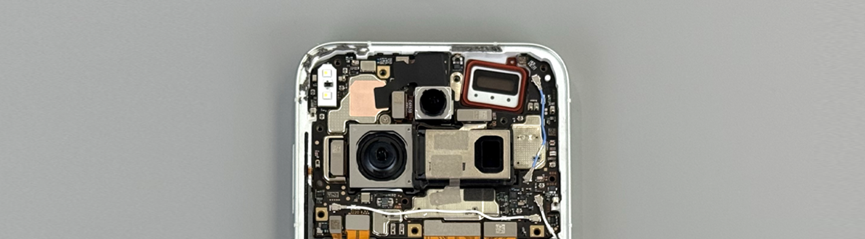 卸下主板剩余的固定螺丝,挑起主板,主板正面集成了多焦段闪光灯,背面贴有多组铜箔散热片,核心芯片对应区域填充了导热硅脂,用于快速导出芯片运行时产生的热量。