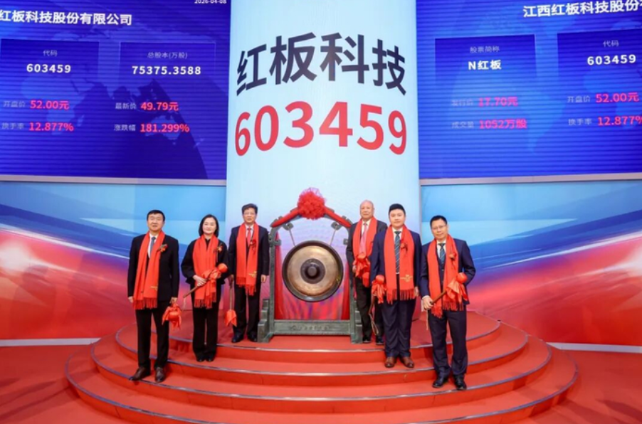 4 月 8 日,OPPO、传音、华勤、闻泰科技等行业巨头供应商江西红板科技股份有限公司登陆上交所主板:上市首日大涨 225.99%,收盘价 57.70 元,总市值434.9 亿元。作为专注印制电路板(PCB)的企业,红板科技以手机 HDI 板为核心业务,2025 年实现营收 36.77 亿元、归母净利润 5.40 亿元,静态市盈率高达80.5 倍。