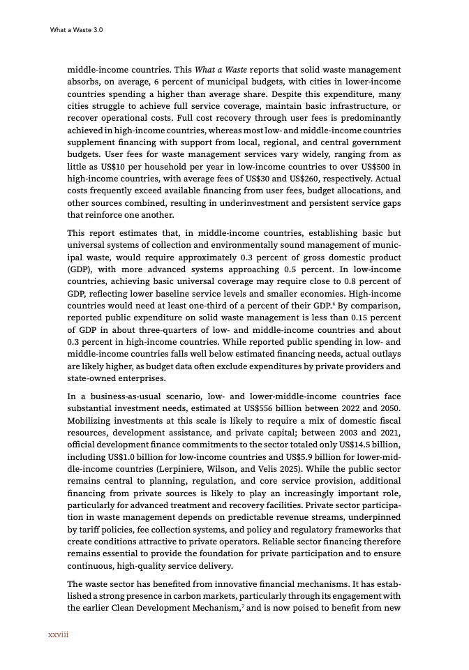 成本与融资约束正成为制约体系升级的核心瓶颈。当前全球固废管理支出已超过2500亿美元,预计到2050年将升至4260亿美元。单位处理成本在不同收入国家间差异显著,从40美元/吨到120美元/吨以上不等。固废支出平均占城市财政预算6%,但多数国家难以实现完全成本回收。测算显示,低收入国家实现基础覆盖需约0.8%的GDP投入,而当前公共支出普遍低于这一水平,导致服务缺口持续扩大。