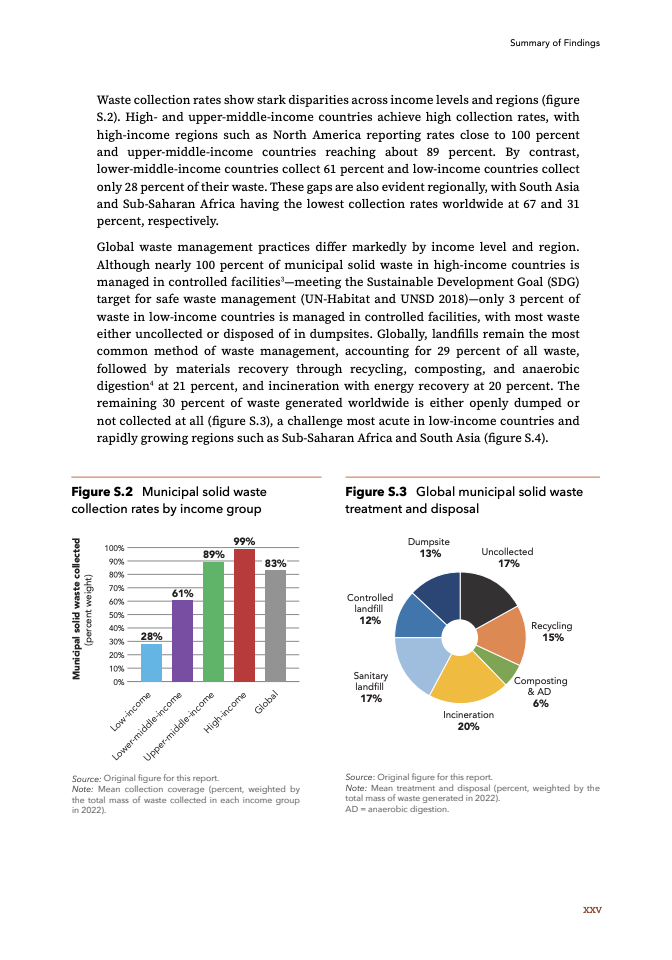 治理能力的不均衡进一步放大了问题的外部性。高收入国家垃圾收集率接近100%,而低收入国家仅为28%,全球仍有约30%的垃圾处于未收集或露天倾倒状态。处理方式上,填埋占比29%,回收与堆肥21%,焚烧20%,但在低收入国家,仅3%的垃圾进入受控处理体系,大量废弃物直接暴露于环境之中。这一结构性缺口不仅削弱城市治理能力,也显著推高环境与公共健康风险。