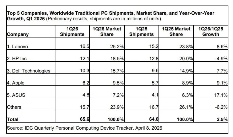 昨天,市场调研机构 IDC 发布了 2026 年第一季度全球 PC 市场初步追踪数据。数据显示,今年 Q1 全球传统 PC 出货量达 6560 万台,同比增长 2.5%,显著高于 IDC 今年 2 月预测的 6360 万台(同比 -0.6%),主要由零部件涨价预期、Windows 10 迁移需求及新品集中上市三重因素拉动。其中,联想以 25.2% 的市场份额稳居全球第一,出货量达 1650 万台,同比增长 8.6%,是市场平均增速的 3.4 倍。与去年同期相比,联想市占率提升了 1.4 个百分点,是前五大厂商中份额增幅最大的企业。相比之下,惠普出货量同比下滑 4.9%,戴尔同比增长 7.7%。前三大厂商合计市场份额达 59.4%,同比提升 0.7 个百分点,行业头部集中趋势进一步加剧。迪士尼新 CEO 上任即裁员,至多 1000 个岗位将被削减