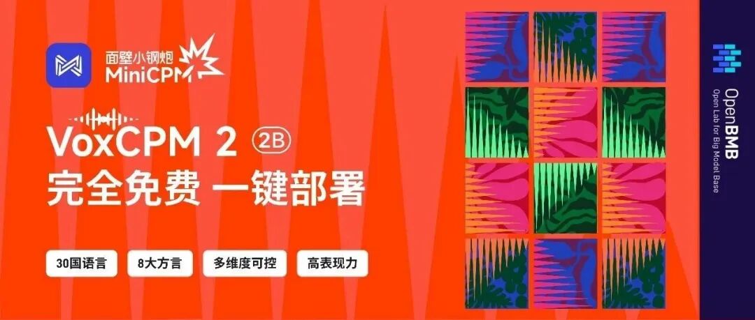 面壁智能日前正式发布并开源语音基础模型 VoxCPM 2,模型参数量仅 2B,基于无分词器(Tokenizer-Free)的扩散自回归架构,将多语种支持、音色设计、通用音色可控与 Hi-Fi 音质集成于一体支持全球 30 种主流语言,针对东南亚 8 国语种(越南语、泰语、印尼语、老挝语、缅甸语、柬埔寨语、菲律宾语、马来西亚语)做了专项优化;中文方言覆盖四川话、粤语、吴语、东北话、河南话、陕西话、山东话、天津话、闽南语共 9 种;无需参考音频,仅凭自然语言描述性别、年龄、语气、情绪等特征,即可凭空生成全新音色;上传参考音频后,在克隆音色的同时,仍可通过文字指令调整语速、情绪与风格;提供参考音频及其文字稿时,可进一步启用「极致克隆」模式,还原音色、节奏乃至细微呼吸声;输出采样率达 48000 Hz,依托 AudioVAE V2 非对称编解码设计,仅需 16kHz 参考音频输入即可直接输出 48kHz 高保真音频,无需外部超分辨率模块。性能方面,VoxCPM 2 在 Seed-TTS-eval 英文测试集取得 1.84% WER、75.3% SIM,中文测试集取得 0.97% CER、79.5% SIM,在开源模型中处于第一梯队。内部 30 语言 ASR 基准测试平均错误率为 1.68%,在老挝语、缅甸语、高棉语等低资源语言上表现尤为突出。🤗 Hugging Face:/model/openbmb/VoxCPM2👾 ModelScope:/models/OpenBMB/VoxCPM2 蜜雪冰城早餐系列多地下架,7.9 元套餐被嫌贵