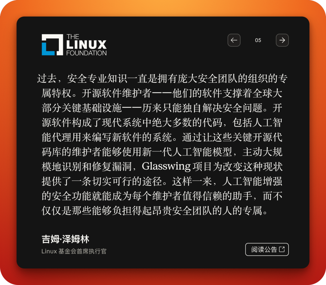 Glasswing 计划的成员包括苹果、亚马逊、谷歌、微软、英伟达、思科、Palo Alto Networks、Linux 基金会等顶级公司和机构,另有 40 多个组织获得扩展访问权限,总计参与机构超过 50 家。