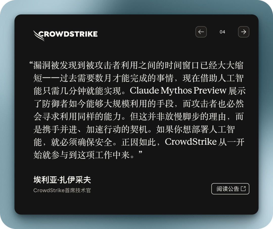 于是,A 社提出了 Glasswing 这个「内测计划」:与其把 Mythos 锁进保险柜,不如让潜在暴露风险最高的巨头公司和机构们先拿到它,扫描自己产品里的漏洞,在更大范围扩散之前把洞堵上。