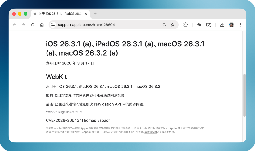但这次不一样了。今年,苹果从 iOS/iPadOS/macOS 26.1 版本开始启用「后台安全改进」政策,第一次实际投入使用,则是在 iOS 26.3 下的小版本上,也即开头提到的 WebKit 漏洞修补。