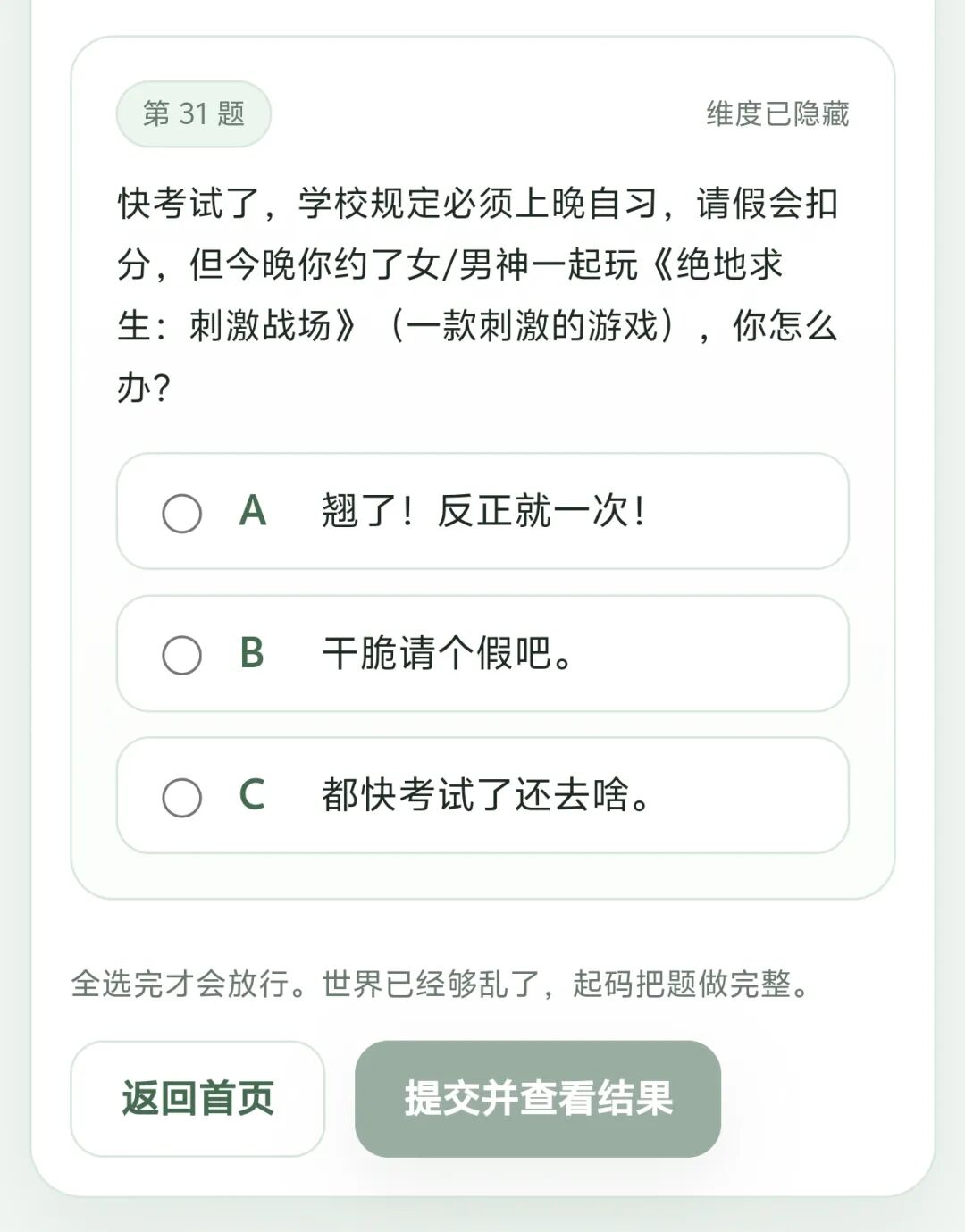 这是一个叫 SBTI 的测试,全称 Silly Big Test Inventory,可以直接理解为「SB 人格测试」,一晚服务器干崩了几次。打开社交媒体全是「DEAD 死者」「MALO 吗喽」「IMFW 废物」的测试海报,配文清一色的自嘲,评论区清一色的「太准了」。说实话,看到结果的时候愣了一下。不是因为被骂了,是因为人格描述写着:「给废物一颗糖,它会还你一个完全信任你、亮晶晶的眼神。」我觉得它比任何 AI 写的性格分析都有意思。这是 B 站 UP 主 @ 蛆肉儿串儿 原文为了劝朋友戒酒随手做的网页。31 道题,5 分钟,没有「稀有的灵魂建筑师」,没有「天生的共情者」,只有一盆当头泼下来的冷水。这东西本身就是 AI 写的代码,只是,令人没想到的是,AI 花了三年学会夸人,一个 UP 主用 AI 手搓了个骂人的网页,反而得到更大的共鸣。和菜头之前写过一篇《AI 是个马屁精》,说得很对,但只说了一半。他举了一个例子,你拿一张图问 AI「请分析一下倭风」,AI 头头是道证明给你看。换个问法「请分析泰国风」,照样论证得滴水不漏。答案不是 AI 给的,是你预设的。AI 只是帮你把偏见打印出来了。你问 AI「同事是不是在针对我」,它给你论证对方品行有问题。你问「我该不该辞职」,它永远从你的角度帮你建模。和菜头说得好,这些不是提问,是用问题的形式包装起来的观点。但他没说的是:当所有 AI 都在做马屁精的时候,SBTI 为什么能靠骂人骂出泼天的流量?可以先对比一下 MBTI。MBTI 告诉你「你是 INFJ,全球仅占 2% 的稀有人格」。你激动地截图发朋友圈,配文「原来我一直是这样的人」。但这不过是巴纳姆效应的高级包装,描述模糊到谁都觉得说的是自己,好听到谁都愿意转发。它和 AI 马屁精干的是同一件事,给你一面美颜过的镜子。SBTI 不给你美颜,它直接告诉你「你是吗喽」——「当人类祖先决定从树上下来、学会直立行走、穿上西装打领带时,吗喽人格的祖先在旁边的大树上看着他们,挠了挠屁股,发出一声不屑的『吱』。」运气不好的话判你「死者」,「删档重开了 999 次,终于发现,这游戏压根就没意思。」骂完你,还给你台阶下,MBTI 不会做这个。因为 MBTI 从来不骂你,它没有台阶可给。MBTI 是美颜相机,让你觉得自己好看。SBTI 就像前置摄像头。,让你看到自己,然后笑出声来。但 SBTI 真正有意思的地方还不只是敢骂人,它压根就不问你怎么了。你想想,AI 需要你先开口。你得先把焦虑和脆弱摊在桌面上,然后它再用 800 字论证你是对的。你喂它情绪,它还你一篇你爱听的小作文。31 道题,没有一道问你「最近压力大吗」「你觉得同事针对你吗」。它问你怎么看待喝酒,问你周末干嘛,问你对规则的态度。然后根据这些屁事,给你判了个「死者」。你转发到朋友圈那张「DEAD,我,还活着吗?」的海报,你以为你在玩梗。但你的朋友看到后心里咯噔一下,因为他知道你最近确实不太好。你不需要编辑一条 500 字的深夜感悟来求助。不需要向 AI 提一个「我是不是太累了」的诱导性问题,然后收获一篇温柔的废话。和菜头说「真正的问题需要事实准确、逻辑清晰、开放性强」。说得对。但有些时候,人们不需要正确的问题,需要的是一个不问问题的出口。一个永远说「你说得对」的朋友,和一个永远说「你说得对」的 AI,区别只在于后者不会在你喝醉时把你拦下来。而 SBTI 会,它直接判你为「DRUNK 酒鬼」。这个人格就是创作者为了劝朋友戒酒而设计的。整个测试的起源,就是一句朋友之间直愣愣的「你喝太多了」。创作者说自己「SHIT」。人格描述写着:「嘴上说这个世界就是一坨 shit,手上第二天早上七点准时起床,挤上 shit 一样的地铁,去干那份 shit 一样的工作。」我觉得这像我们每个人。每天问 AI「同事是不是在针对我」「我该不该辞职」,第二天还是七点起床去上班了。AI 帮你把抱怨升级成一篇逻辑严密的檄文。SBTI 只说:行,你是「SHIT」,嘴上骂骂咧咧,手上该干嘛干嘛。前者让你以为自己在思考,后者让你知道自己在发疯。知道自己在发疯,比「被 AI 论证我是对的」舒服多了。SBTI 的测试页面有个细节。进度条旁边写着「0/31」,下面一行小字:「世界已经够乱了,起码把题做完整。」我们连做完 31 道题的耐心都快没有了。问 AI 之前答案已经想好,刷短视频三秒不爽就划走,朋友圈里的长文从来只看第一行。同样是用 AI,一个人搓出了 SBTI,挤崩三次服务器。另一个人让 AI 帮自己论证「同事就是在针对我」,然后心满意足地睡了。区分两者的不是谁更会用 AI,是谁还愿意听一句不顺耳的话。昨晚刷屏的那个「废物」标签,说到底只是一个随机算法贴的纸条、但这么多人抢着被贴,还是因为 AI 在对你微笑,MBTI 在对你微笑,短视频推荐算法也在对你微笑。所有人都在夸你,夸到你自己都不信了。偶尔被人直愣愣地说一句「你是废物」,反而觉得踏实。就像上学时最好的那个朋友,从来不说「你好棒哦」。他只会说「你傻啊」,然后把笔记借给你抄。