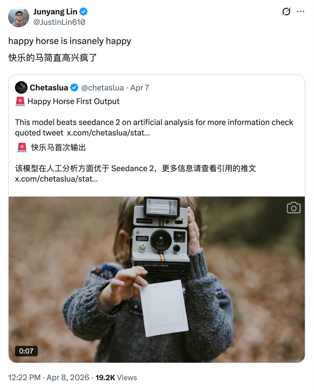 在阿里今天正式宣布之前,前阿里千问大模型负责人林俊旸昨天就在 X 转发了关于 HappyHorse 的消息,附文「happy horse is insanely happy」。评论区当时就有人在猜测,看来 HappyHorse 可能是千问的视频模型。3 月 16 日,阿里巴巴正式成立 Alibaba Token Hub「ATH」事业群,由 CEO 吴泳铭直接负责,ATH 覆盖了通义实验室、MaaS 业务线、千问事业部、悟空事业部、AI 创新事业部,几乎把阿里现有 AI 关键拼图全部装进了一个框架里。