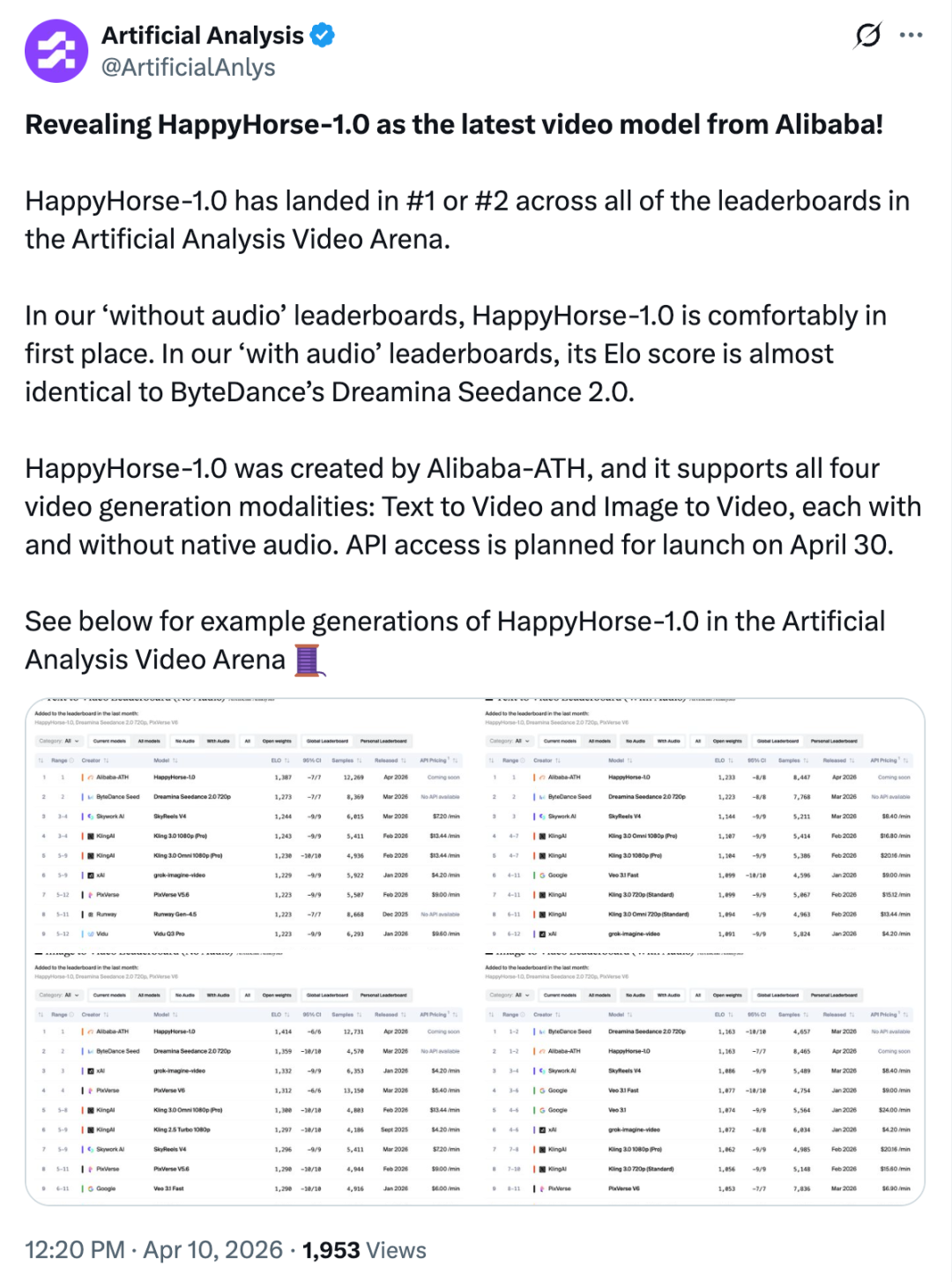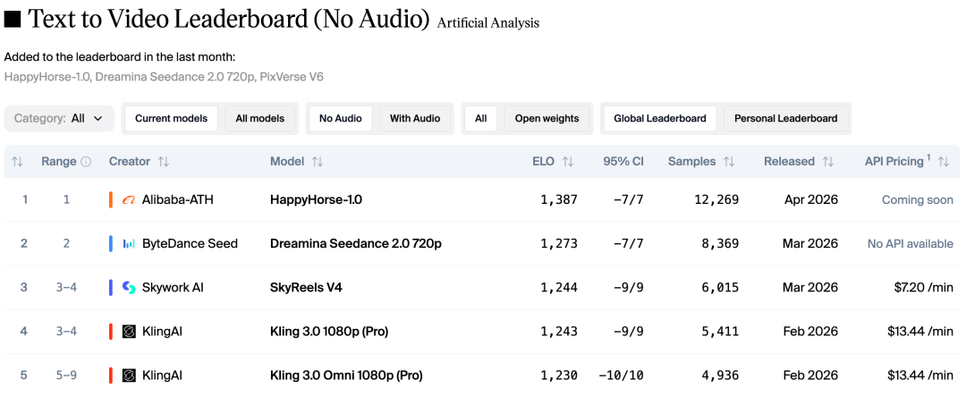 AI 评测平台 Artificial Analysis 也在阿里确认这一消息后,在 X 平台迅速发文,表示 HappyHorse-1.0 目前已经在视频竞技场的所有排行榜上都取得了第 1 或第 2 名的好成绩。在平台「无音频」排行榜上,HappyHorse-1.0 稳居第一;「有音频」排行榜中,它的 Elo 分数几乎与字节的 Seedance 2.0 完全相同。Artificial Analysis 还提到 HappyHorse-1.0 支持四种视频生成模式:文本转视频、图像转视频,每种模式均可选择是否添加原生音频,而 API 接口计划于 4 月 30 日开放。在这则推文下,Artificial Analysis 给出了多个 HappyHorse 视频生成的实例。通过与Seedance 2.0、Kling 3.0 Pro、grok-video-imagine 和 PixVerse V6 的对比,我们能看到 HappyHorse 这匹突然杀出来的黑马,潜力确实不小。提示词:一部皮克斯风格的短片,讲述一个紧张兮兮的小交通锥梦想成为大型比赛的终点线标志杆的故事。
