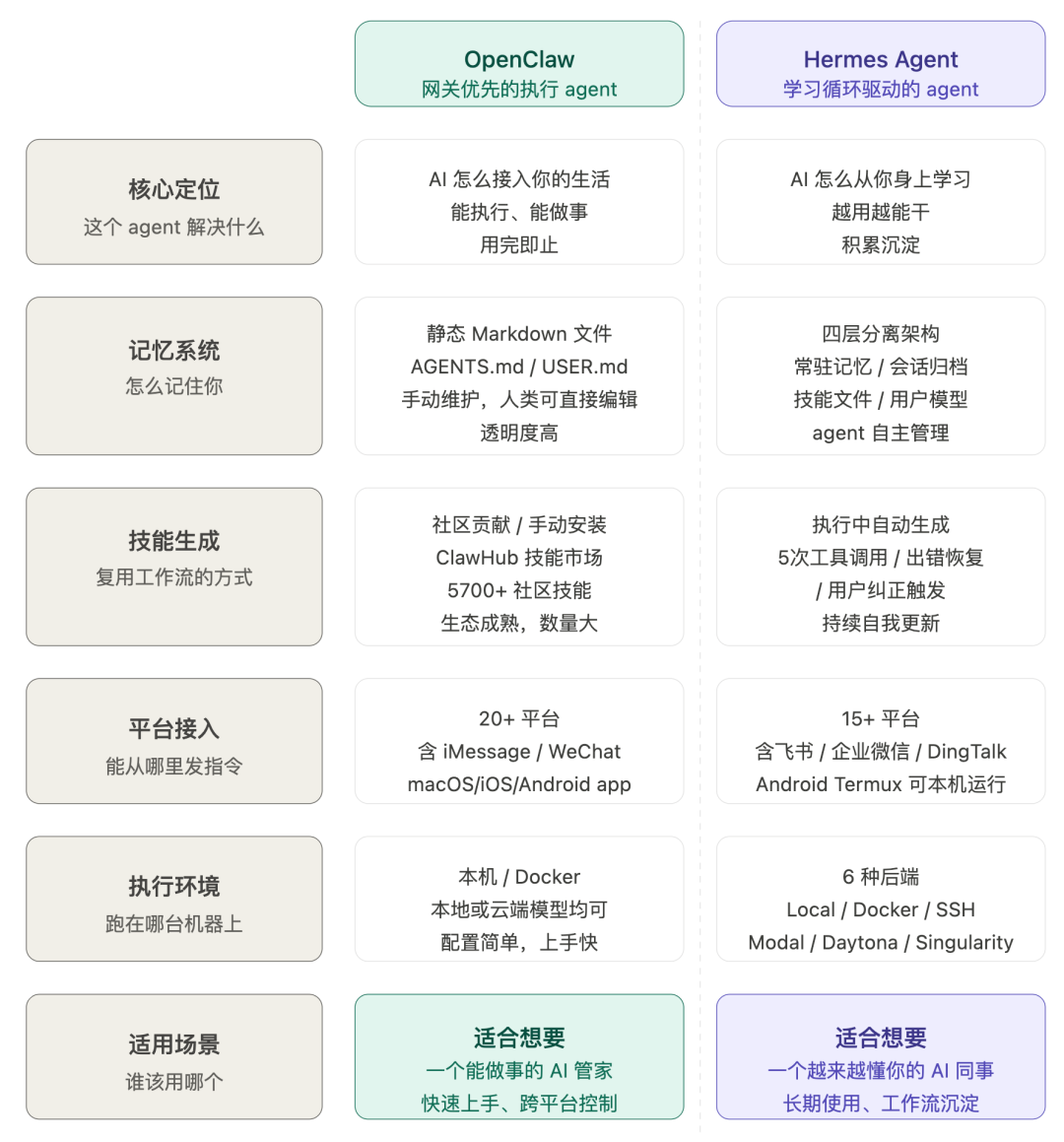 在之前那篇讨论 Harness 该怎么翻译的文章,有读者留言说可以叫 Hermes 爱马仕。本以为是谐音梗,没想到确实有一个 Agent 产品叫 Hermes,而且在 GitHub 的热门榜单上,整个月都排名第一,目前已经累计有 4.8 万个 Stars。和这段时间以来爆火的 Agent 龙虾不同,一个是支持所有操作系统和平台的专属个人 AI 助手,Hermes 的介绍写着「the agent that grows with you」,与你共同成长的 Agent。听着就很高级,但这确实是 Hermes Agent 的独特之处。它有一套内置的学习循环框架,OpenClaw 靠的是修改配置文件,联合多个 Agents 来处理各项复杂的任务,Hermes Agent 是一个单一的 Agent 框架,它的能力会随着实际使用的运行时间增加而不断增强。它解决的问题是,当所有人都在讨论 agent 能做什么,但没人注意 agent 用完之后什么都不留下,而 Hermes Agent 现在能记住「什么方法有效」。社交媒体上也不少推荐 Hermes Agent 的帖子,有人说刚刚从 OpenClaw 转移到了 Hermes,是他做过最明智的选择。还有人分享「爱马仕橙皮书」,表示 Hermes Agent 是一个被严重低估的产品,它算得上目前最强大的开源 AI Agent 框架之一。Hermes Agent 由 Nous Research 团队研发,查看 GitHub 上的发布记录,从 3 月中旬更新 V0.2.0 版本到昨天发布 V0.8.0,每次更新都有大量代码提交合并,以及实用的功能更新,是一个非常活跃的开源项目。首次推出是 2 月 25 日,https://nousresearch.com/releasesKarpathy 之前分享的 LLM Wiki 笔记大法,利用大语言模型和 Obsidian 笔记工具,完成对自己知识和研究库的搭建,也被立刻加入到了 Hermes 的内置技能里。Hermes Agent 不仅支持安装在电脑上,通过 Termux 终端模拟器,还能安装在 Android 手机上。模型和网关的配置与 OpenClaw 类似。值得一提的是,目前还没有被 Claude「封杀」,我们仍然可以通过登录 Claude 的 Pro 及以上会员直接完成大模型配置。同时,Hermes Agent 也提供了自家的,基于订阅模式的 Nous Portal 登录。Nous Research 团队的 Hermes 4 模型今天,小米大模型也发文正式宣布,「Xiaomi MiMo 已接入全球顶级 Agent 框架 Hermes Agent,并且限免两周。」🔗 Hermes Agent 官网:https://hermes-agent.nousresearch.comOpenClaw 的核心是把我们的 AI 从聊天框里彻底拉出来,接入到实际的工作、学习和生活中,真正执行任务。它能连接微信、企微、飞书,能跑终端命令、控制浏览器,帮我们发邮件、管理日程安排等。但 OpenClaw 有一个缺陷是它无法从我们日复一日的使用中,自动学习进化。OpenClaw 的记忆是静态的——我们把信息写进配置文件,它读取,会话结束,等下次再读。它不会主动地从执行过程里提炼什么,也不会因为我们纠正过它一次,下次就自动做对。所有的工作流用过一遍,还是需要我们提醒它,打包成 Skill 或者专门的提示词等。虽然现在有一些专门的 Skill 被设计用来赋予 OpenClaw 自学习的能力,但是、 Hermes Agent 是从底层架构的学习循环,到记忆系统,和 Agent 执行内部,都把「越用越懂你」作为重点。Hermes Agent 的特别之处是一个闭合的学习循环 Learning Loop。每次任务完成后,Hermes 会检查:这次执行值不值得写下来?触发条件很具体,工具调用超过 5 次、中途出过错然后自己修复了、用户做过纠正、或者走了一条不明显但有效的路径。满足任何一条,它就会在 ~/.hermes/skills 目录里生成一个 Skill 文件。和技能市场上那些被广泛使用的 Skill 一样,这份自动生成的文件是下次可以直接跟着走的操作流程。名称、描述、步骤、涉及的工具调用,全部写清楚,格式遵循 开放标准,理论上是可以跨兼容 agent,在 OpenClaw、Claude Code、Cursor 等工具内使用。同时,技能文件不是一次写死。Hermes Agent 在后续执行中发现更好的路径,会直接修改。修改优先用 patch,打补丁的方式,只传入旧字符串和替换内容,而不是整体重写。这个选择背后有两个考虑:全量覆写容易把原来好用的部分一起破坏掉,而 patch 只碰有问题的地方,更安全,token 消耗也更少。前几天,《生化危机》女主角 Milla Jovovich 和工程师 Ben Sigman 联合发布了开源 AI 记忆工具 MemPalace,两天内获得超过 23000 个 GitHub stars。它的设计灵感来自古希腊演讲家的记忆技法,把要记的东西放进一座想象中的建筑的不同房间,需要时走进去取。整个系统分成五层:Wing(项目或人物)、Hall(记忆类型)、Room(话题)、Closet(压缩摘要)、Tunnel(跨话题引用)。仅靠这个层级结构,MemPalace 称检索准确率就从 60.9% 提升到 94.8%。MemPalace 的核心判断是:不应该让 AI 来决定什么值得记,AI 的判断不可信,不如全存下来,让检索来决定什么有用。月初 Claude Code 50 万行代码泄露事件中,另外一种关于记忆的解决方案则是依靠 AI,有网友发现 Claude 会使用做梦的方式,用 Auto Dream 来自动整理我们的记忆文件。Hermes 的记忆系统也经过专门设计,一共分四层,每层负责不同的事,在不同的时机被调取。第一层叫常驻提示记忆。两个文件,MEMORY.md 和 USER.md,存放需要在每次会话开始时自动加载的上下文。总字符上限只有 3575 个,这个数字是 Hermes Agent 故意收窄的,目的是强迫我们筛选,而不是什么都往里塞。第二层是会话归档。每次对话写入 SQLite 数据库,用全文索引检索。Hermes Agent 需要历史上下文时,主动发起查询,把检索结果经过一次 LLM 摘要,只把和当前任务相关的部分注入进来。文档链接:https://hermes-agent.nousresearch.com/docs/user-guide/features/memory第三层是技能文件,也就是上面说的学习循环