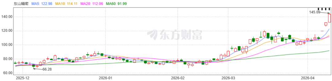 近期,东山精密发布公告表示,公司预计2026年第一季度归属于上市公司股东的净利润为10亿元至11.5亿元,同比增长119.36%至152.27%,单季度盈利规模创下历史新高。