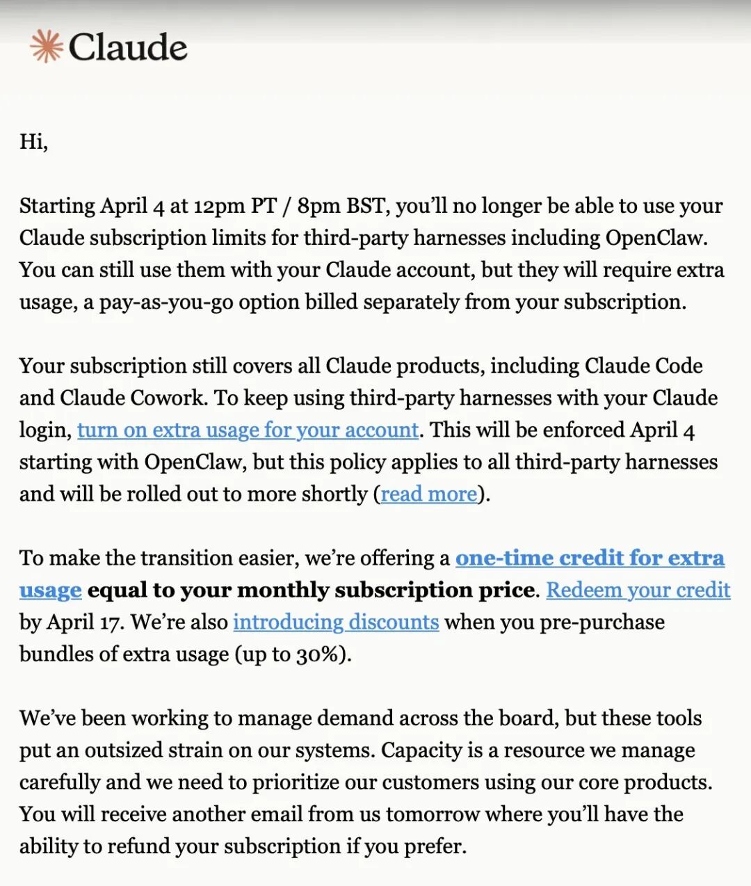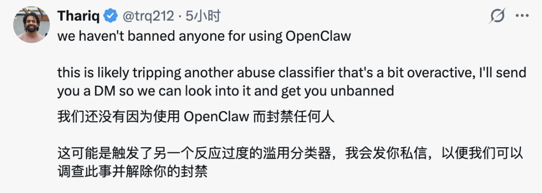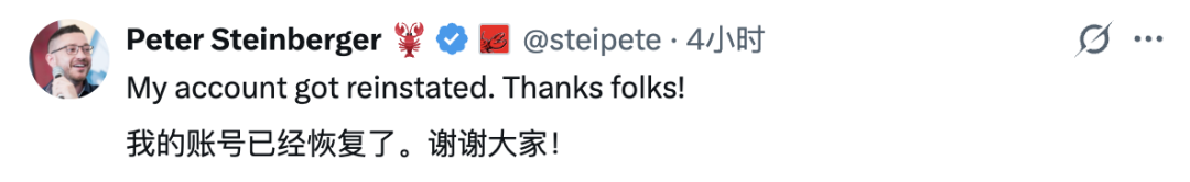 就在刚刚,龙虾之父的 Claude 被「封号」了。知名开源 Agent 框架 OpenClaw 的创始人 Peter Steinberger 在 X 平台发文称自己的 Claude 账号遭到封禁,并晒出了一封来自 Anthropic 安全团队的邮件:我们对你账号的可疑信号进行了内部调查,认定存在违反使用政策的行为。因此,我们已撤销你访问 Claude 的权限。如需对我们的决定提出申诉,请填写此表单,或点击此处了解更多申诉流程。邮件措辞简短,未说明具体违规条款,亦无任何事先警告。Steinberger 在推文中写道:「伙计们,以后要确保 OpenClaw 还能跑在 Anthropic 的模型上,恐怕是越来越难了。」OpenClaw 是目前生态最为活跃的开源 Agent 框架之一,很多开发者用它来让大模型干具体的活——连接外部工具、自动执行任务、帮你管日历回消息,相当于给大模型装上了手脚。而 Anthropic 的 Claude,目前公认在代码和推理这块是最能打的。结果最受欢迎的开源框架创始人,被最强模型供应商以「可疑活动」封号了。推文传开后,引发了轩然大波,评论区里有网友问 Steinberger,被封的是 API 还是别的什么。他的回答是:「两个都封了。」,这意味着他连日常的兼容性测试都跑不了了。有人追问他为什么还在用 Anthropic 的服务——毕竟他年初已经入职 OpenAI 了。他解释说,这要分两件事来看:他在 OpenClaw Foundation 的工作,目标是让 OpenClaw 兼容所有模型供应商;在 OpenAI 的工作,是帮助产品战略。用 Anthropic,只是因为要做端到端测试,确保 OpenClaw 的每次更新不会跟主流模型出问题。「我们一直在跑 e2e 测试,确保每次框架改动不会出问题。这些账号和 Key⋯⋯或者说,曾经是我的。」事件持续发酵后,Anthropic 员工 Thariq Shihipar 出现在评论区:「我们没有因为任何人使用 OpenClaw 而封号。这很可能是另一个有点过于敏感的滥用检测分类器误判了。我会私信你,看看能不能查清楚并帮你解封。」很快,Steinberger 发推确认账号已恢复。到这里,封号本身算是有了说法,Anthropic 官方口径是这只是一次系统误判,非人工决定,与 OpenClaw 无关。但如果你了解 Steinberger 和 Anthropic 之间这两年的恩怨情仇,就会觉得这件事不只是一次风控误判那么简单。Steinberger 是 iOS 开发圈的老人,技术能力毋庸置疑。但他最开始打造 OpenClaw 的时候,给自己定位是「产品经理」——所有代码,后端、前端、测试、文档,全部用 Claude Code 生成,他一行都没亲手写过,只负责用自然语言描述需求。OpenClaw 用到的那些能力,超长上下文、工具调用、多步骤推理规划,全部脱胎于 Claude,然后却被拿来跟 Anthropic 旗下工具竞争生态位。事情最早可以追溯到项目改名——OpenClaw 最初叫 Clawdbot,Anthropic 以商标侵权为由施压,项目后续被迫改成了现在这个名字。当被网友问到为什么去 OpenAI、不选 Anthropic 时,Steinberger 也调侃道:「一家欢迎我加入,另一家寄来的是律师函。」改名只是前奏,真正的矛盾在于这东西太能消耗算力了。有人仔细算过:月付 200 美元的 Claude Max 订阅,实际跑起来消耗的算力价值接近 5000 美元。放到 Anthropic 的服务器上,OpenClaw 就是个无底洞。就在封号风波的前几天,很多 OpenClaw 用户悄悄收到了一封邮件:从太平洋时间 4 月 4 日起,Claude 订阅额度不再覆盖 OpenClaw 在内的第三方工具。Anthropic 给的理由是资源消耗太大,机器扛不住,要优先保障自家产品的用户体验。当时,Peter Steinberger 不留情面地批评道,时机真是巧得有趣——Anthropic 先把流行功能复制进自己的封闭框架,然后再把开源软件挡在门外。更多细节欢迎回看 APPSO 此前文章:Anthropic 封杀 OpenClaw,龙虾之父:说服失败回头看看 Anthropic 最近两个月密集发布的东西:Dispatch、Claude Code Channels、Computer Use,每一项针对的几乎都是 OpenClaw 的核心能力。封号这件事本身或许只是个误判,但 Anthropic 对第三方生态的态度已经说得很清楚了:不愿意只做提供 API 的管道,要把从模型到应用的整条链路都抓在自己手里。今天被挡在门外的是一个开源 AI 框架,明天被拿捏的,可能就是每一个依赖 AI 运转的工作流。如果 AI 的蜜月期真的就此结束,那个开放共建的氛围再也回不来,这大概是所有人都不想看到的结局。✉️ 邮件标题「姓名+岗位名称」(请随简历附上项目/作品或相关链接)