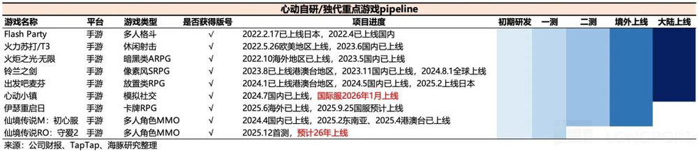 26年主要的pipeline就是《心动小镇》国际服和《仙境RO:守爱2》,此外还有一款游戏处于研发中。《心动小镇国际服》已经1月上线,《仙境RO》因为是心动运营多年的精品IP续作,类型是3D开放世界MMO,预计首年TTM还是有希望冲个20亿+的流水。去年底刚做了首测,按照一般的测试-上线周期,预计上线可能要到年中。