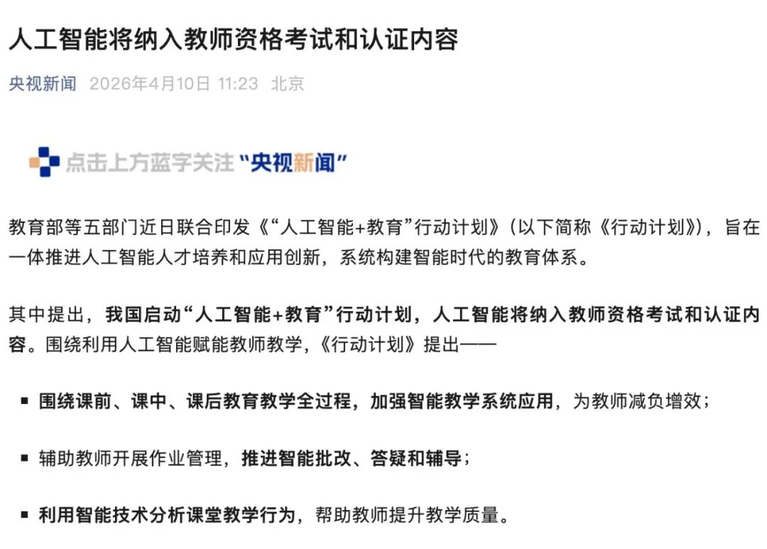 据新华社、央视新闻报道,教育部等五部门近日联合印发《「人工智能+教育」行动计划》,旨在一体推进人工智能人才培养与应用创新,系统构建智能时代的教育体系。昨日,教育部在新闻发布会上披露了该行动计划的核心内容。其中最受关注的一项举措是:人工智能将被正式纳入教师资格考试和认证内容,AI 能力将成为未来教师的基本职业素养之一。教学上,行动计划提出围绕课前、课中、课后的全流程教学场景,加强智能教学系统的应用,帮助教师减负增效;同时辅助开展作业管理,推进智能批改、答疑和辅导;借助智能技术分析课堂教学行为,帮助教师提升教学质量;面向基础教育,行动计划明确加快普及中小学生人工智能教育,要求开齐、开足、开好相关课程,推动人工智能教育全面纳入地方课程体系。此外,计划还鼓励开展人工智能跨学科教学,推动其融入课后服务、研学实践等环节;在高等教育层面,行动计划要求推动人工智能成为高校公共基础课,按学科专业分类编写教材,推动全体学生掌握 AI 相关知识。与此同时,高校将被引导开设人工智能交叉融合课程,丰富跨学科、跨专业课程群,培养复合型交叉人才,并根据产业结构的智能化升级趋势,新设一批适应新技术、新产业、新业态的学科专业。亿咖通科技官宣正式承接 Flyme OS 全业务