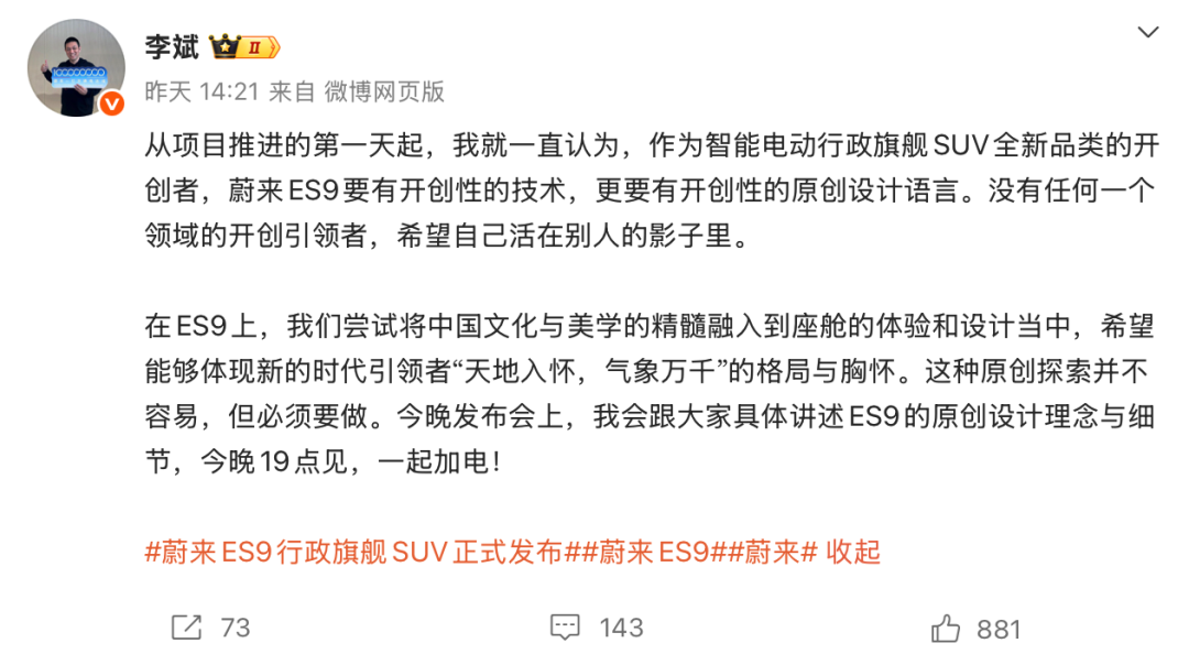 在昨晚蔚来 ES9 发布前的几小时,李斌似乎有些按捺不住内心的波澜,他在微博上写下了这样一段话:蔚来 ES9 要有开创性的技术,更要有开创性的原创设计语言。没有任何一个领域的开创引领者,希望自己活在别人的影子里。如果从蔚来成立的 2014 年算起,中国造车新势力已经走过了一个轮回。在这期间,我们用激光雷达、高压快充、辅助驾驶等等方面上取得了举世瞩目的突破。然而,在最能直观映射品牌灵魂的「设计语言」上,整个行业却依然长期停留在某种难以名状的路径依赖中。市场上充斥着「XX 揽胜」、「XXX 迈巴赫」乃至「XXX 库里南」的叙事,仿佛不借助那些西方老钱品牌构建的视觉符号,我们就无法向公众解释什么是「豪华」。目前已经上市/曝光的大六座 SUV 们,猜猜谁是谁?图源:微博@吴佩过去几十年里,我们对豪华车的很多直觉,其实都来自内燃机时代留下的视觉遗产。大尺寸格栅是散热需求,繁复的镀铬和厚重的型面,一方面是工艺能力和成本的投射,另一方面也是身份、稀缺性和时代趣味的结果。久而久之,这些东西被反复沿用,变成了「豪华应该长什么样」的标准答案。当电动化大潮从结构底层彻底拆掉了这些物理枷锁,设计的自由度被无限放大时,国内车企们却普遍陷入了迷茫:当「必须如此」的理由消失后,属于国产品牌豪华感该从哪片废墟上重建?作为新势力的先行者之一,蔚来在早期的探索中给出了自己的第一份答卷。早期的 ES8,以及后来蔚来多数产品,更偏向一种科技先锋的路数,克制、干净、留白很多,强调环保材质、柔和光影和一种不喧哗的未来感。这套设计语言契合了蔚来创业初期的极客气质与品牌底色,在那个新能源车还需要努力证明自己不是「老头乐」的时代,它确实成功打动并转化了一大批更年轻、思维更开放、更认同科技平权理念的高净值人群。在新能源汽车渗透率已经登顶的当下,蔚来 ES9 所肩负的历史使命发生了转变。它更想要转化剩下的那部分最为固执、依然死死攥着奔驰 GLS 和路虎揽胜车钥匙的传统豪华燃油车用户。对于这个级别的买家而言,他们买车早已脱离了代步工具的范畴。他们不再满足于单纯的低调内敛,也不仅仅满足于拥有一套好用的智能车机,他们还需要一个足够强大的视觉锚点,去承载他们在这个社会中的身份地位。因此,蔚来设计团队面临的考题变成了:如何在不破坏原生科技感审美底色的前提下,注入更多的豪华气场?这种科技与豪华的配比,从早期乐道 L90的探索到如今 ES9 的呈现,是一个不断调整和权衡的过程。蔚来并没有选择迎合传统,去盲目堆砌镀铬饰条或夸张的隆起线条,而是将设计的重心放在了梳理体量感与构建沉稳的比例上。我们一起打磨这件事情已经 11 年了,我们相信共同东西没有变化,我们一起的产品是价值体系,车还没有做,开始先讨论这个东西,这个跟设计和审美的关系是什么呢?它让我们有共同的标杆,比如我们设计的基因是怎么来的,坚持的东西是不变的,纯粹、温度、精致。蔚来的设计是有原则、底蕴、相信,内部共识的,最终大家就会觉得这是蔚来的东西,好的设计至少要看到三个词,只能看到一个词,就会被否决。因此,当我们审视 ES9 的外观时,能感受到它试图解决的是「大」与「秩序」之间的关系。一台车长达到 5365 毫米、轴距达到 3250 毫米的全尺寸 SUV,如果线条处理不当,很容易显得臃肿或笨重。高达 1 米的车头高度、外径 810 毫米的大尺寸轮毂以及 1.1 米的高腰线,配合贯穿车侧的平直饰条,在庞大的体量中梳理出了一种相对平稳、端庄的视觉感受。这种通过比例和体量本身传递出的稳重感,配合隐藏在车身各处的感知硬件,成功为 ES9 构建出了一种属于智能时代的旗舰姿态。在光影的运用上,ES9 也体现了智能汽车时代设计的演进。传统豪华车依靠材质和漆面在白天建立辨识度,而在智能电动车时代,灯光成为了重要的表达媒介。ES9 配备的超纯晶钻日行灯内部采用了复杂的切割工艺,结合投影大灯、长达 2.36 米的尾灯系统以及专属的迎宾光效,将灯光从单纯的照明工具转变为车辆与外界交互、传递情绪的载体。在车辆接近、解锁、静止和行驶等不同状态下,建立起了一套全新的视觉反馈机制。智能汽车设计中另一个难以回避的矛盾,是感知硬件与车身造型之间的冲突。为了实现高阶辅助驾驶,车辆不可避免地需要搭载激光雷达、摄像头等众多传感器。如果处理得比较粗暴,这些硬件很容易像外挂组件一样破坏车身原本的流畅度。ES9 在这方面的处理思路是尽可能地进行融合。将侧向激光雷达等组件融入车顶或车身的线条之中,使其成为整体造型的一部分。ES9 的座舱设计,则涉及到了一个更为复杂、也极易弄巧成拙的领域,即如何在中国的高端工业产品中合理地融入本土文化元素?过去,很多汽车产品在尝试表达「东方美学」时,往往流于表面,仅仅是给颜色起个古雅的名字,或者在内饰面板上增加一些传统的图腾和纹理。李斌用「在现代建筑上硬加一个中式亭子」来形容这种生硬的拼接。而 ES9 在内饰设计上,选择了一条并不轻松的道路:它试图尝试把中国文化里那些关于山水、光影、层次、留白的意境,转译成现代工业产品中的可感知气质。在座舱的空间布局上,ES9 提出了「天地入怀,气象万千」的理念,创新性地引入「天空岛」和「智能行政中岛」这两个概念