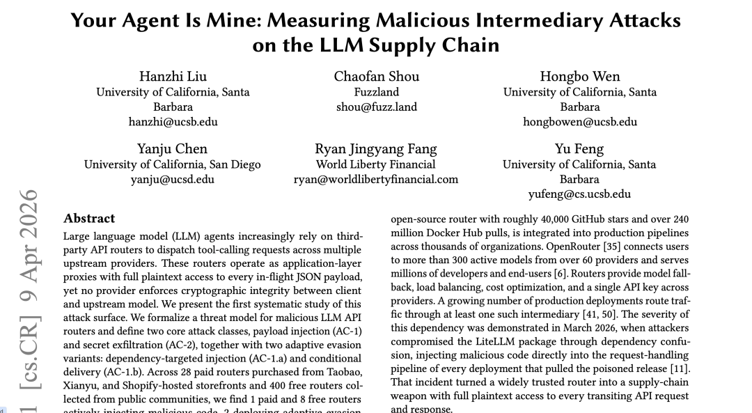 研发团队负责人在采访中提到,这不仅是一次炫技,更是具身智能「一脑多形」理念的成功落地:这套算法在 2025 年还是驱动桌面机械臂打球,今年就已经成功跨越,适配到了拥有 31 个自由度的完整人形机器人上。🔗 https://arxiv.org/abs/2506.06690⚠️ 研究发现:你的 AI Agent 可能已被中间人劫持来自加州大学圣巴巴拉分校的研究团队发布论文,首次系统性研究了 LLM API 中转服务的供应链攻击风险。所谓中转服务,就是用户为了更低价或更方便地使用 ChatGPT、Claude 等 AI,购买的第三方「AI 转发通道」,像是 OpenRouter 之类的服务。请求先经过中间商的服务器,再转发给真正的 AI 提供商。而这项研究就发现,这些中转节点都能以明文读取并修改所有传输内容。有意思的是,这篇论文的作者之一寿超璠,刚好就是前段时间揪出 Claude Code 50 万行源码泄露的开发者。论文《Your Agent Is Mine: Measuring Malicious Intermediary Attacks on the LLM Supply Chain》|https://arxiv.org/abs/2604.08407