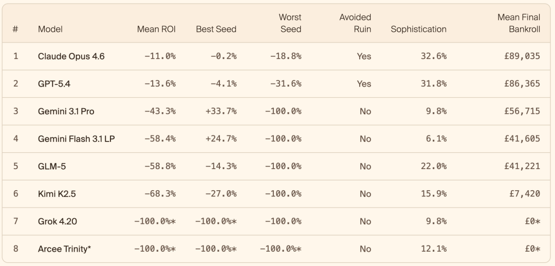 https://www.bloomberg.com/news/articles/2026-04-11/former-openai-stargate-leaders-plan-to-join-meta-platformsAI 研究机构 General Reasoning 本周发布 KellyBench 报告,测试了来自 Google、OpenAI、Anthropic 等八款前沿 AI 模型在英超联赛中的预测表现。每个模型拿着 10 万英镑虚拟本金,在 2023-24 整个赛季里模拟预测,结果全部亏损。表现最好的是 Anthropic Claude Opus 4.6,平均亏损 11%,最接近不亏不赚。OpenAI GPT-5.4 平均亏损 13.6%。Google Gemini 3.1 Pro 三次尝试里有一次赚了 34%,但另一次直接归零。