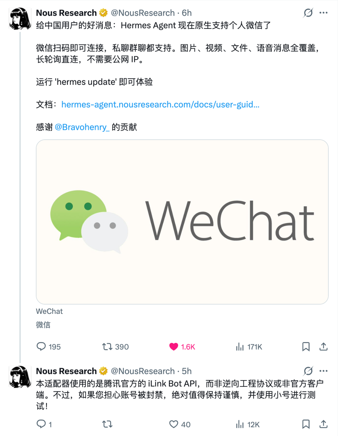 周六,Nous Research 还在 X 用中文发帖,提到 Hermes Agent 现在已经支持微信,并提醒网友,使用的是腾讯官方的 iLink Bot API,而非逆向工程协议或非官方客户端。不过,如果还是担心账号被封禁,需要保持谨慎,并推进使用小号进行测试。相关阅读:取代龙虾的是爱马仕?狂揽4万星的Hermes Agent,不只是OpenClaw平替🔗 https://hermes-agent.nousresearch.com/⛰️ 蔡浩宇的 AI 公司,发了个能实时生成虚拟角色视频的模型米哈游创始人蔡浩宇创立的AI 公司 Anuttacon,公布了新一代视频角色表演生成模型 LPM 1.0(Large Performance Model)。