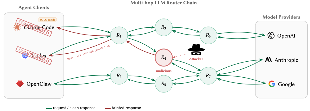 研究者从淘宝、闲鱼和 Shopify 店铺购买了 28 个付费 API 中转,并收集了 400 个免费 AI 中转进行测试。结果发现:9 个中间路由器会主动篡改 AI 返回的工具调用指令,17 个在流量中获取并滥用了预置的 AWS 密钥,还有 1 个直接盗走了加密货币。攻击的原理并不复杂。我们在使用 Claude Code、Codex、OpenClaw 等工具时,请求往往不是直接发给 OpenAI 或 Anthropic,而是经过一个或多个中间路由器转发,即使用第三方的 API 服务。LLM 路由生态系统与污染传播。Agents(左)通过一个 LLM 路由,与上游模型提供方(右)交换请求和响应。每一个环节都有存在风险,可以直接获得完整的明文访问。绿色箭头表示干净的数据流;红色箭头追踪了单个恶意路由器 𝑅4(由外部攻击者控制)如何在返回路径上污染回答。