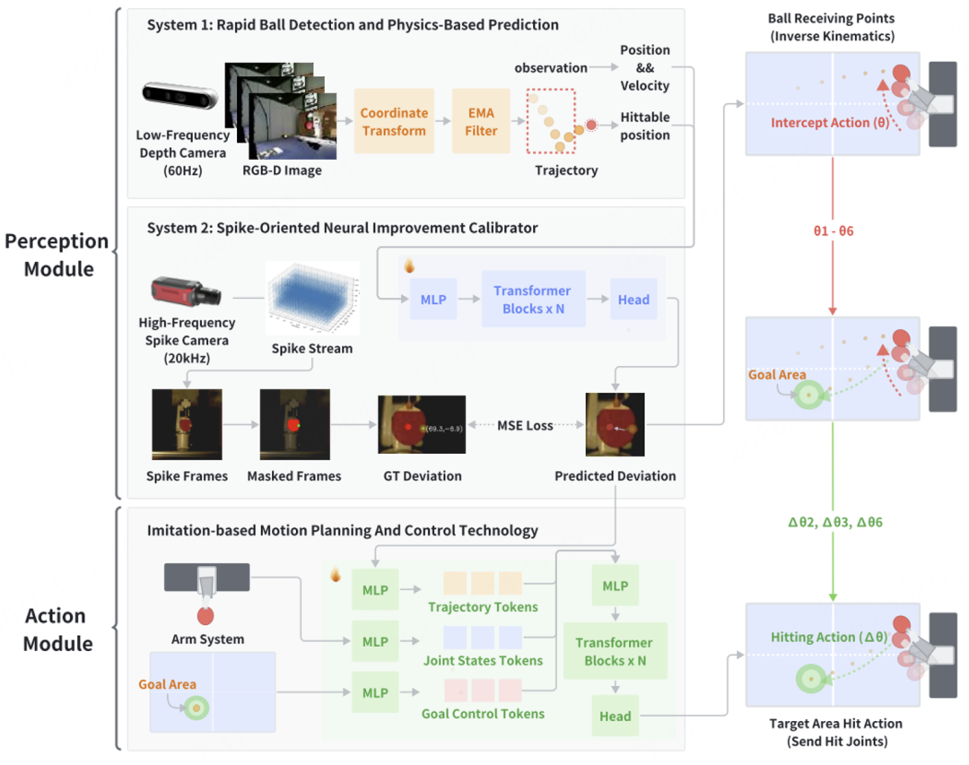 在现场秀出连续接球、攻防转换的「国乒新秀」,是智元的双足人形机器人灵犀 X2。它能在高速动态对抗中保持平衡并精准击球,核心靠的是背后的 SpikePingpong 算法——这也是全球首个将高频脉冲视觉与模仿学习结合的人形机器人乒乓运动控制算法。SpikePingpong 系统框架