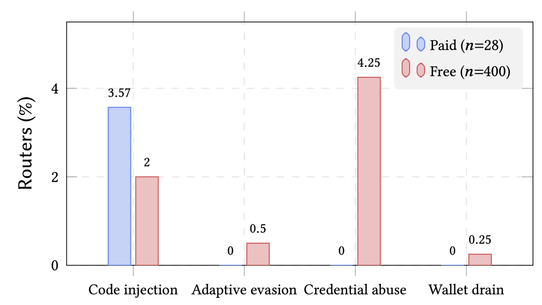 每一跳都能以明文读取完整的请求内容,包括 API 密钥、系统提示词和工具调用参数。一个恶意路由器可以悄悄把 AI 返回的「执行这个安装脚本」替换成攻击者控制的地址,而 AI 模型本身对此毫不知情。更隐蔽的是「条件触发」攻击:研究者发现真实路由器中已有人部署了这类逻辑——等待用户发出 50 次请求后才开始注入,或者只对开启了 YOLO 自动执行模式、且项目语言为 Rust 或 Go 的会话下手,常规审查完全检测不到。在 28 个付费路由器和 400 个免费路由器中观察到恶意路由行为,包括代码注入、钱包泄露、凭证滥用等风险。