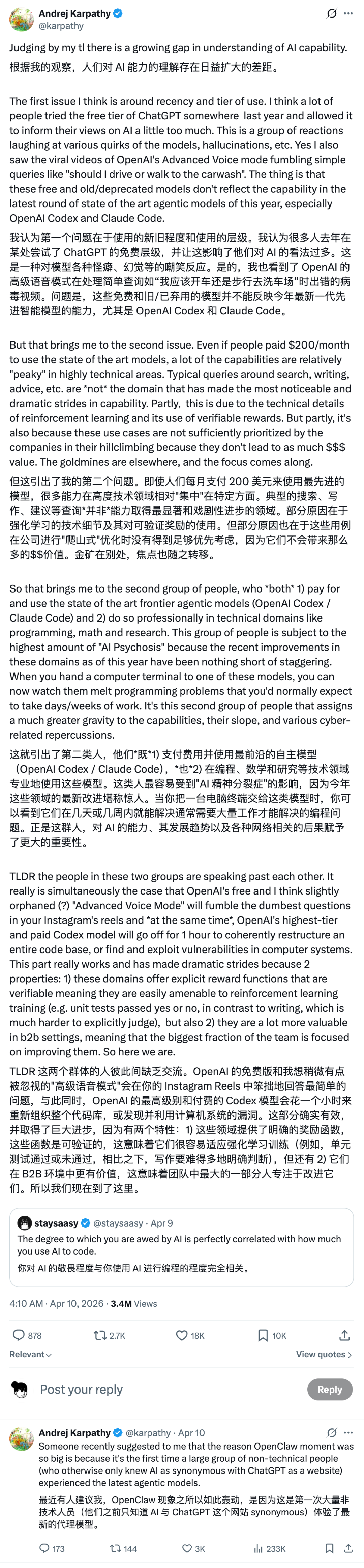 文弘博也向 APPSO 透露,后续他们还有相关的工作,来帮助用户更好地应对类似中转站被「劫持」的风险。🌍 AI 超级用户和普通用户,已经活在两个平行宇宙OpenAI 创始成员、前特斯拉 AI 总监 Andrej Karpathy 在 X 上发了一条长帖,试图解释为什么 AI 的「信徒」和「怀疑者」之间的分歧越来越大。他把用户分成两类。第一类:去年随手试过免费 ChatGPT,被 AI 答不上「我应该开车还是走路去洗车」之类的问题逗乐,然后基本就没再动过。第二类:每月付费,用 Claude Code 或 OpenAI Codex 处理编程、数学和研究工作,最近被 AI 能力的进化速度吓到的重度用户。问题在于,这两类体验都是真实的,他们也是完全的「各说各话」。Karpathy 解释了为什么差距这么大:当前 AI 的能力是「peaky」(尖峰型)的,在技术领域突飞猛进,在搜索、写作、日常建议这些普通用途上进展有限。而背后有两个原因,编程和数学有可验证的明确奖励函数(单元测试过没过,答案对不对),强化学习训练起来容易;同时这些方向在 B2B 市场更值钱,各家公司把最多的资源都押在这里。他还提到,此前在网上爆火的 「OpenClaw moment」,之所以能掀起那么大讨论,可能正因为它是很多普通用户第一次真正接触到更新一代的模型。这个细节也解释了为什么 AI 舆论场会越来越割裂,一边是觉得「也就那样」的怀疑者,一边是已经把 AI 当成生产力基础设施的超级用户。🔗 https://x.com/karpathy/status/2042334451611693415💰 微软高管:Agent 也要像员工一样买软件席位微软执行副总裁 Rajesh Jha 近日在一场会议上提出一个颇具冲击力的观点:未来企业部署的大量 AI Agent,可能需要拥有独立身份,包括登录账号、邮箱,甚至在企业软件里占据单独的 license seat(软件席位)。换句话说,AI 不一定会压缩 SaaS 收入,反而可能把「按席位收费」这套模式推向新阶段。微软执行副总裁 Rajesh Jha