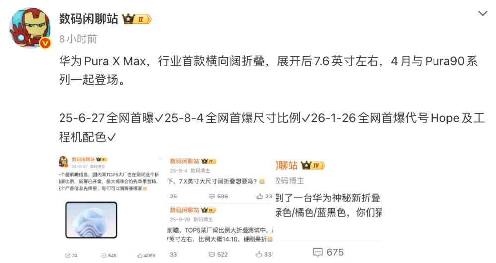 华为目前已宣布,Pura系列及全场景新品发布会定档4月20日14:30。同时,华为还公布了Pura90 Pro Max、Pura90 Pro两款新机的完整配色信息。而除了全新的Pura90 系列,一直以来也有消息称华为将带来阔折叠屏手机的迭代。华为终端BG首席执行官何刚也表示,“Pura家族不只Pura 90系列,超超超多全场景新品,小伙伴们可以期待一下!”博主@数码闲聊站 的爆料也显示,“华为Pura X Max,行业首款横向阔折叠,展开后7.6英寸左右,4月与Pura90系列一起登场。”与此同时,博主@定焦数码 的爆料中也提到了这款华为Pura X Max部分细节信息。按照爆料来看,全新的华为Pura X Max将带来Pura X Max、X Max典藏版版本,并采用其他厂商少用的配色,也是 “眼前一亮”的色。外屏 5.3英寸,展开之后内屏 7.5英寸。就渲染图来看,其虽然采用了横向对折设计,但屏幕明显要更宽一些,后置镜头组件采用了横向排列方案,并采用了一个凸起的模块设计,闪光灯组件目测在模块外。展开后的屏幕比例目测与平板接近,这应该会带来更好的软件适配表现。外屏镜头组件安置在屏幕顶部中间,内屏则安置在了屏幕右上角。就整体的图片信息来看,这款华为Pura X Max视觉效果还不错,实际的真机表现令人期待。除此之外,此前曾有消息称其将配备红枫四摄影像系统,有望搭载5000万像素主摄、4000万像素超广角镜头、800万像素长焦镜头、一颗150万多光谱通道红枫原色摄像头。这与最新曝光的设计图不同,不过这些细节信息还需要等待后续的官方信息才能确认。参考来看,此前发布的华为Mate 80搭载麒麟9020芯片,Pro版本12GB内存版本搭载麒麟9030芯片,16GB内存版本搭载麒麟9030 Pro芯片,Pro Max版本和非凡大师版本搭载麒麟9030 Pro芯片。另外,全新的华为Pura90 Pro Max、华为Pura90 Pro已上架官网,并开启了新品预订。整体的外观设计上,两款新机都采用了类似的设计,但配色不同。华为Pura90 Pro Max带来橘子海、翡翠湖、霞光紫、晨曦金、曜石黑等可选配色,华为Pura90 Pro带来粉红芭乐、橘子汽水、椰青白、桑果黑等配色方案。细节规格方面有爆料称,华为Pura90系列可能会带来标准版、Pro版、Pro Max版三个可选版本。以往的爆料中还提到过,华为 Pura 90 系列中杯测50Mp 1/1.28"±可变光圈主摄,潜望镜升级50Mp,全系多光谱摄像头,除了中杯,其它高配版本都在测1英寸超级主摄。机身尺寸方面,目前全系开案1.5K 2.5D直屏+LIPO四窄边技术,中杯6.58英寸左右,大杯系列都是6.87英寸左右,尺寸变大了。苹果“重新定义”iPhone计划曝光,后续新品均有调整