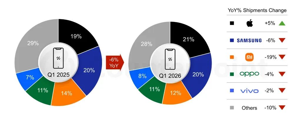 目前,时间来到了2026年的4月中旬,今年的第一个季度已经正式过去。随之而来的智能手机市场调研报告也陆续发布。调研机构CounterPoint Research最新发布的一份分析报告中就展示了今年第一季度全球智能手机市场的表现情况。这份报告中显示,2026 年第一季度,全球智能手机市场仍面临压力,出货量同比下降 6%,原因是 DRAM 和 NAND 存储元件短缺以及需求减弱。尽管部分市场表现稳定,但整体市场情绪仍较为谨慎。这主要是因为厂商调整了定价和生产策略,包括推迟产品上市和减少新品发布。与此同时,由于预期零部件价格上涨和物流成本上升,一些厂商选择提前发货,抵消了出货量的更大降幅。具体的品牌表现方面,苹果市场份额由去年同期的19%升至21%,领跑全球市场。三星市场份额占比20%,排名第二,份额占比与去年同期持平,且与苹果之间的差距不大。小米继续保持全球市场第三的排名,份额占比12%,低于去年同期的14%。OPPO(包括一加和真我)份额占比为11%,排名第四。结合来看,苹果今年第一季度同比增长5%,是前五排名中唯一同比上涨的品牌。而这是由于其超高端定位和高度整合的供应链,使得苹果在应对内存涨价方面的表现最为稳健。同时,iPhone 17 系列的持续强劲需求、以旧换新计划以及生态系统粘性,推动了整体销量的增长。位列第二的三星出货量同比下降了 6%。这主要是由于大众市场的需求减弱以及Galaxy S26 系列的发布延迟。尽管如此,Galaxy S26系列上市初期势头依然强劲,Ultra机型的吸引力最大。同时,三星有效地提高了产品均价,同时加强了其设备的高端定位。小米虽然继续保持全球前三的位置,但其降幅在前五品牌中最大,出货量同比下降了 19%。这主要是受到了存储涨价的影响。不过,小米在高端市场的吸引力也在增强,小米 17 系列的表现就比较不错。另外,虽然vivo同比略有 2%的下降,但整体仍表现良好。据悉,目前的市场波动主要受存储涨价和成本上升影响。这也是最近一段时间中被多次讨论的信息。至于备受关注的“市场何时平稳”这一问题,以往的消息显示其有望在2027年恢复。对此,相关的分析显示,虽然预计存储芯片价格到 2027 年年中将趋于稳定,但不太可能恢复到之前的水平。不过,目前出现的很多都是预测信息,实际情况如何还有待后续观察。苹果“重新定义”iPhone计划曝光,后续新品均有调整连续两个月销量腰斩,2025款本田雅阁还值不值得买?