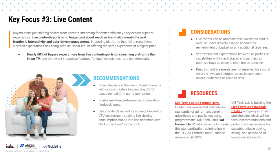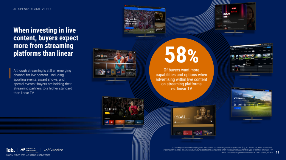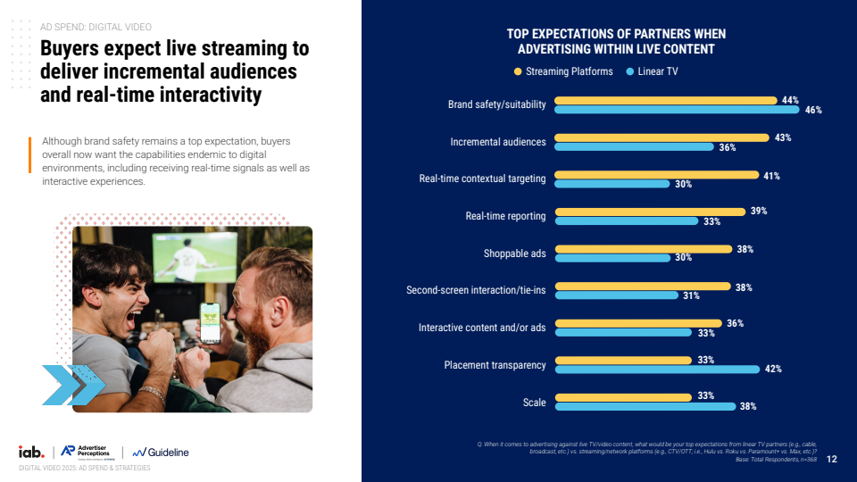与此同时,流媒体平台在直播内容中的角色正在被重新定义。58%的广告主认为流媒体应提供超越线性电视的能力,包括增量受众覆盖(46%)、实时定向(41%)及互动广告形式(38%)。这意味着直播不再只是流量入口,而成为数据驱动与互动体验融合的商业场景,平台能力的差异将直接影响预算分配。