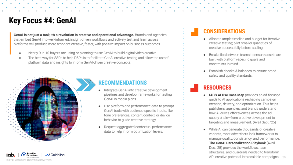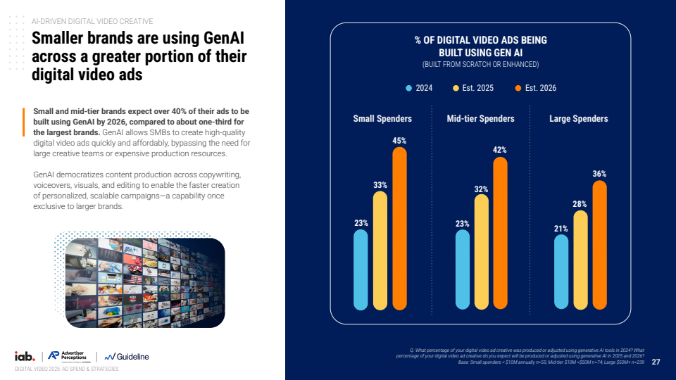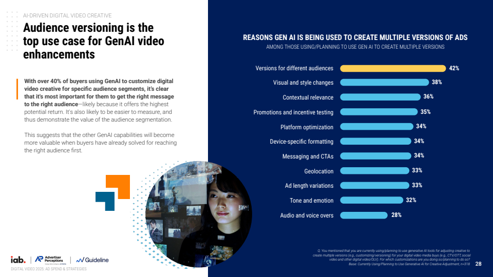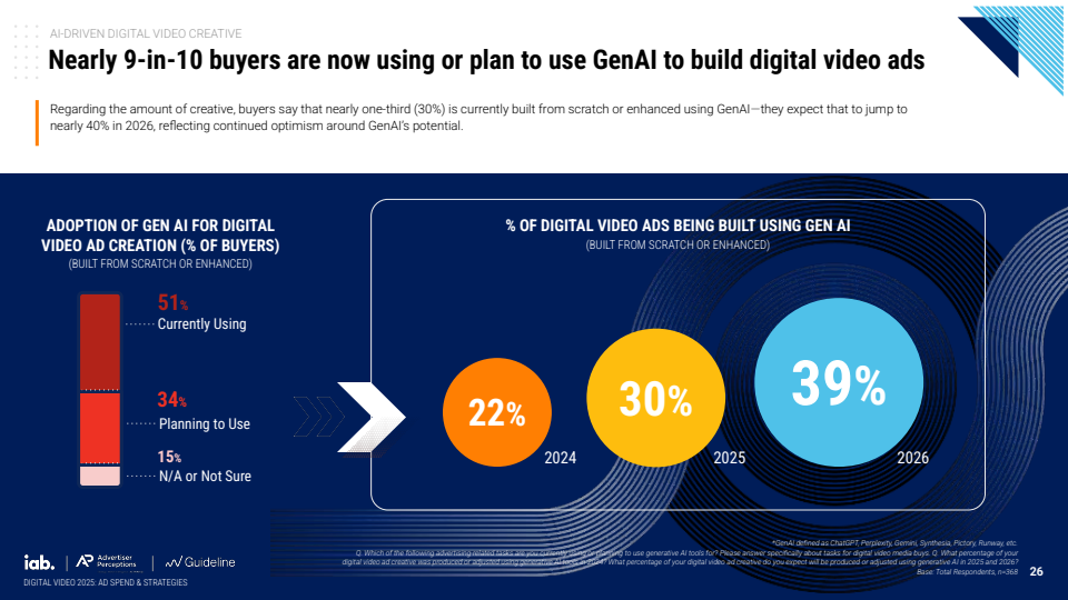 生成式AI的引入则进一步改变了内容生产函数。2025年已有约30%的视频广告通过GenAI生成或优化,预计2026年将升至39%,接近四成水平。近九成广告主已使用或计划使用该技术,其中中小品牌应用比例更高,体现出技术对创意生产门槛的显著降低。当前最核心的应用场景是受众定制化,42%的广告主利用AI生成多版本创意,以提升转化效率。