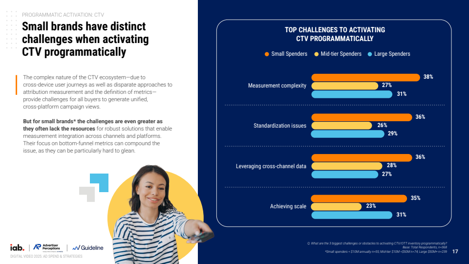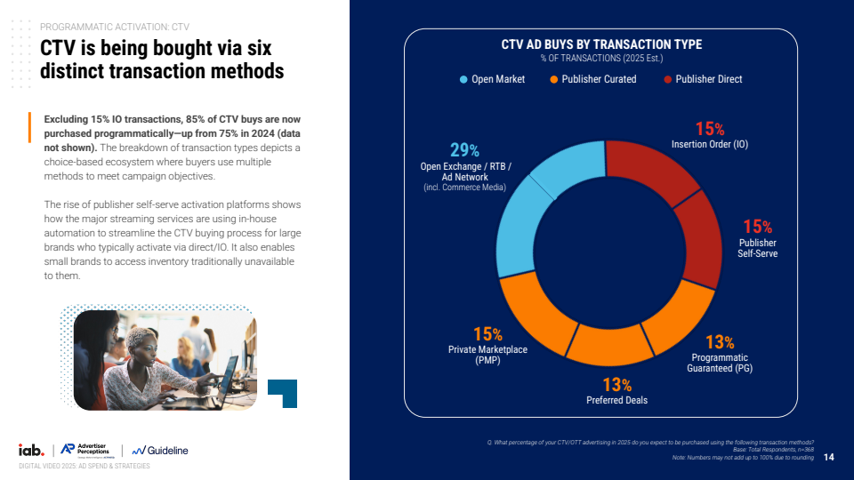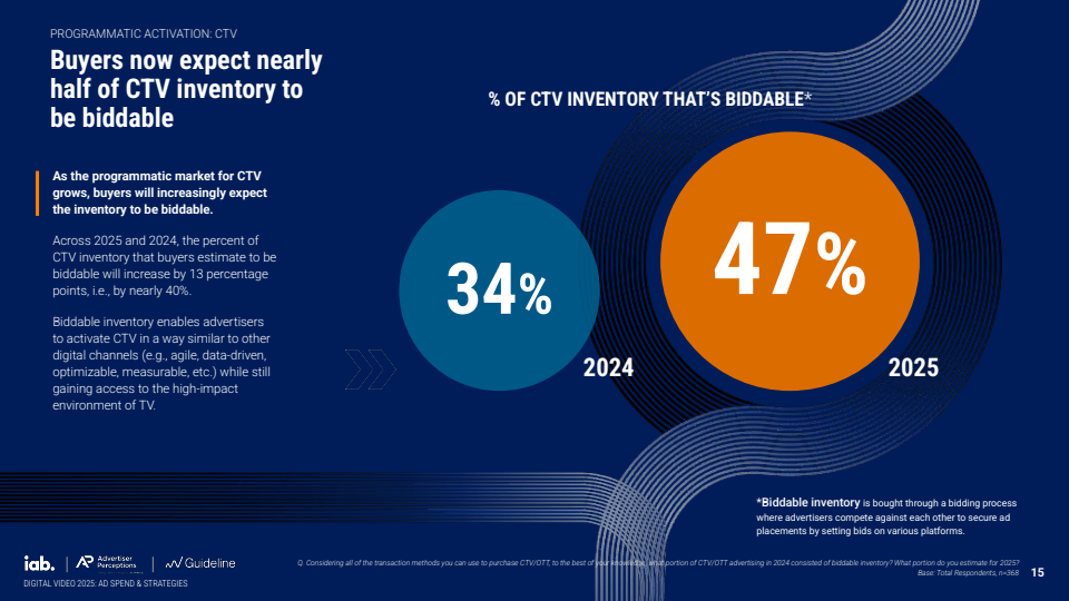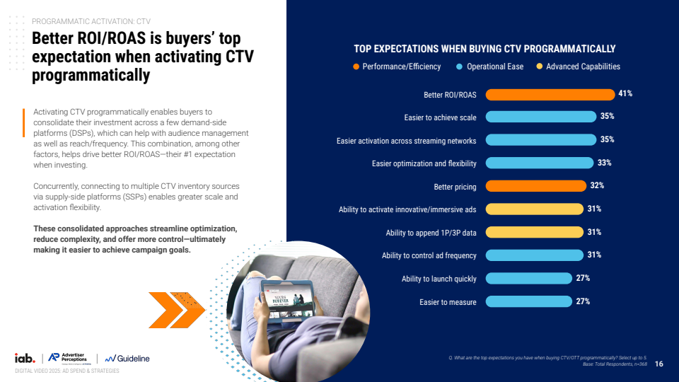 在交易与技术层面,CTV正加速向程序化生态演进。2025年约85%的CTV广告通过程序化方式完成,其中开放竞价占29%,私有市场与保量交易各占约13%-15%。更为关键的是,可竞价库存占比由2024年的34%提升至2025年的47%,增长近40%。这一变化使CTV逐步具备与传统数字渠道一致的可优化、可测量特征,也使ROI/ROAS成为41%广告主最核心的评估标准。