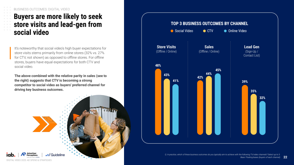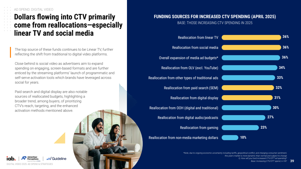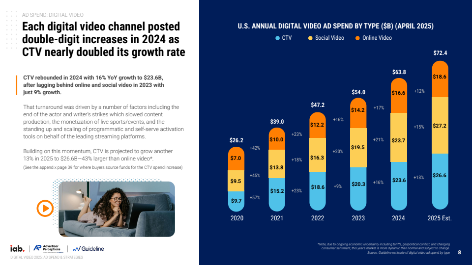 从细分结构看,CTV、社交视频与在线视频构成三大核心增长支柱。2024年CTV广告收入达到236亿美元,同比增长16%,较前一年明显提速,预计2025年将达到266亿美元,继续保持13%的增长。社交视频与在线视频分别达到272亿与186亿美元,整体呈现协同扩张态势。其中CTV在规模与效果之间取得平衡,逐步成为连接品牌与转化的关键媒介形态。