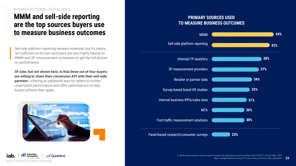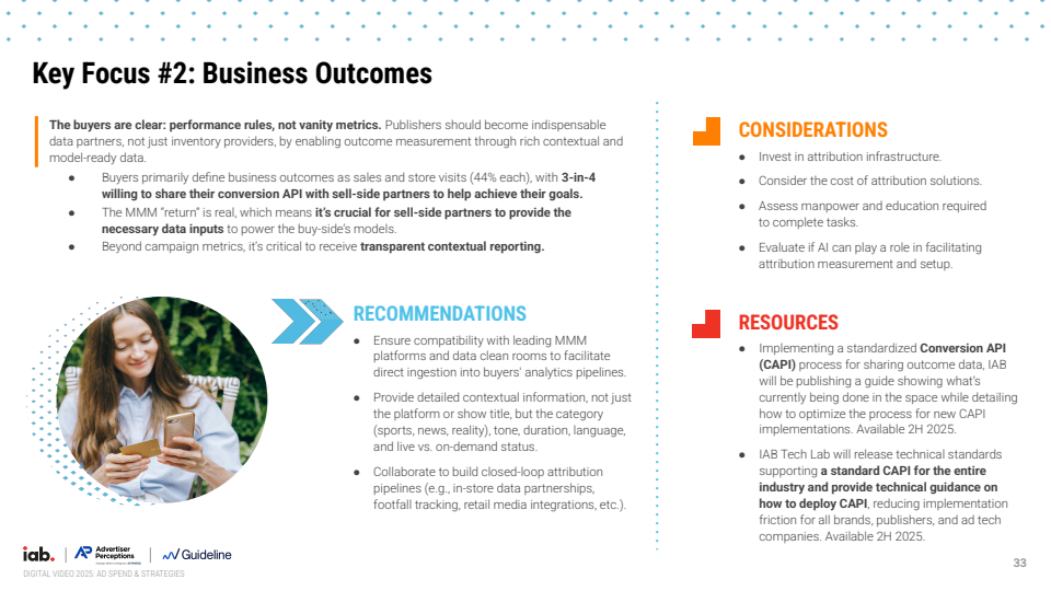 在测量与数据层面,广告主正构建多元归因体系。MMM模型使用率达到44%,与平台数据报告(42%)并列核心来源,同时结合第三方测量与一方数据形成交叉验证。55%的广告主强调投放与版位级KPI的重要性,47%关注内容邻接数据,反映出对精细化归因与品牌安全的双重需求。此外,约四分之三广告主愿意共享转化API,推动行业向更深层数据协同演进。