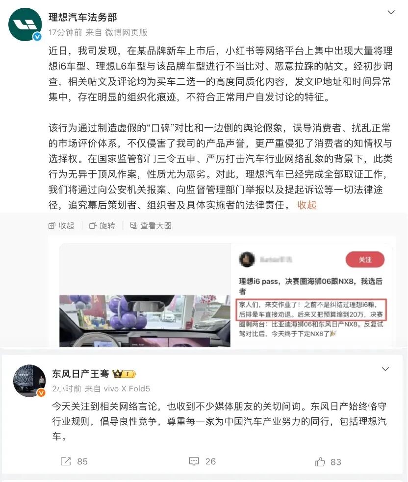 据澎湃新闻、鞭牛士报道,理想汽车 CEO 李想日前在朋友圈公开发文称,某日系品牌大量雇佣「营销号」对理想产品进行「拉踩」,并海量使用空白账号的「黑水军」捏造虚假信息、攻陷产品评论区,严重影响理想汽车正常经营。李想直言「这属于反内卷规定中最恶劣的行为」,并表示将通过法律手段维权,同时呼吁相关部门介入整治,「不能让不受管制的海外品牌破坏了汽车行业反内卷的良好成果和市场氛围」。此番言论矛头直指东风日产。有车圈博主曝光,全网近期出现大量模板化水军通稿,标题统一为《试驾 NX8 和 i6 后,我彻底无语了……》,内容清一色吹捧东风日产 NX8、拉踩理想 i6,话术高度雷同,疑似有组织的恶意营销行为。理想汽车法务部官方账号随即发文,进一步披露调查细节:「相关帖文及评论均为买车二选一的高度同质化内容,发文 IP 地址和时间异常集中,存在明显的组织化痕迹,不符合正常用户自发讨论的特征。」对此,东风日产汽车销售有限公司新能源品牌总经理王骞通过官方认证账号回应称:「东风日产始终恪守行业规则,倡导良性竞争,尊重每一家为中国汽车产业努力的同行,包括理想汽车。」另据 IT 之家消息,李想昨日针对理想汽车被黑事件再发朋友圈:第一次被黑时,有些人劝他要成熟、要自我反省,为什么只黑你不黑别人?第二次被黑时,又有人建议「可以喊疼,但要控制好声音的分贝,要让打人的人舒服」。然后,就会有第三次、第四次和第 N 次。「其实,大家都爱你的成熟和隐忍。」马斯克版微信亮相 App Store,周五开放下载