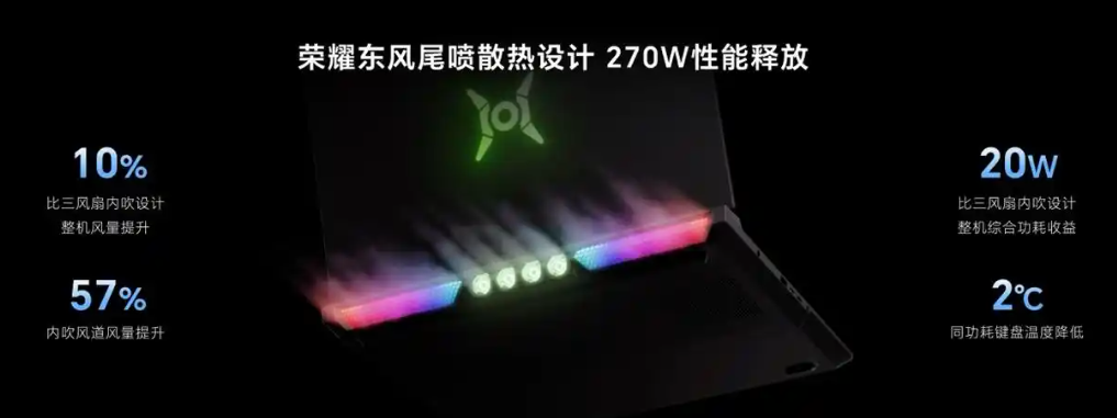 在散热设计上,荣耀WIN游戏本首次搭载了荣耀东风尾喷散热引擎技术,通过创新的“离心轴流混吹系统”,优化了机身内部的热交换结构。官方测试数据显示,相比传统散热方案,新机的整体风量提升达11%,有助于维持高性能运行时的稳定与低温。