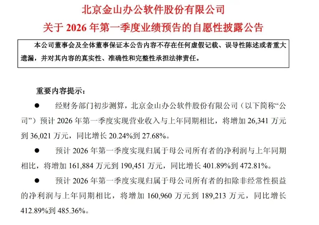 昨晚,金山办公披露 2026 年一季度业绩预告,营收与利润双双超预期,其中净利润增幅尤为亮眼。预计今年一季度实现营业收入 15.65 亿元至 16.62 亿元,同比增长 20.24% 至 27.68%;归母净利润预计达 20.22 亿元至 23.07 亿元,同比增幅高达 401.89% 至 472.81%,直接翻超四倍;扣非净利润预计为 19.99 亿元至 22.82 亿元,同比增幅同样超过四倍。不过,这一「暴增」背后的主要驱动力来自投资收益的集中释放,而非主营业务的爆发。金山办公在公告中说明,报告期内部分对外投资基金项目产生了较大额度的投资收益,对净利润增长贡献显著。剔除该投资收益影响后,公司归母净利润约为 4.87 亿元至 5.44 亿元,同比增长 20.99% 至 35.15%;扣非净利润约为 4.65 亿元至 5.19 亿元,同比增长 19.19% 至 33.14%。主业盈利能力依然保持稳健增长态势。💡 微软高管:AI 智能体将像员工一样购买软件许可证