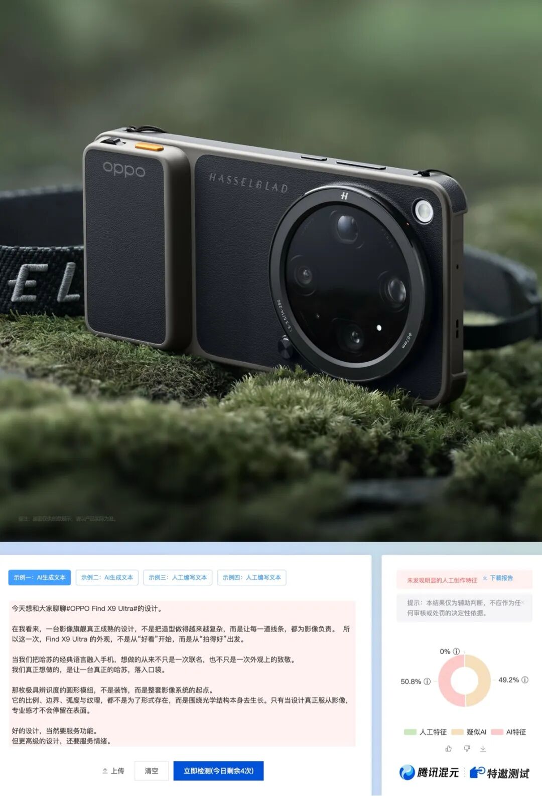 昨天,OPPO 首席产品官刘作虎在微博发文,阐述了即将发布的影像旗舰 Find X9 Ultra 的设计理念。他表示,Find X9 Ultra 的外观设计不是从「好看」出发,而是从「拍得好」出发,「让每一道线条,都为影像负责」。在设计语言上,刘作虎强调,那枚标志性的圆形影像模组并非装饰,而是整套影像系统的物理起点,其比例、弧度与纹理均围绕光学结构生长,形式彻底服从于功能。金属材质的冷静感、克制的线条、严谨的秩序,以及标志性的哈苏橙色点缀,共同构成了这台设备的专业气质。他将这抹橙色定义为「信号」——是拿起手机、准备开始创作的信号。影像规格方面,Find X9 Ultra 搭载哈苏双 2 亿超清影像系统、第二代丹霞色彩还原镜头、新一代哈苏大师模式、LUMO 凝光影像系统及 8K 超清电影级视频,此前曝光信息还显示其主摄规格为 2 亿像素 f/1.5,并配备 5000 万像素 10X 潜望超长焦。值得注意的是,这条微博经腾讯混元 AI 检测工具检测后,AI 特征占比达 49.2%,疑似 AI 特征占比 50.8%,人工特征为 0%。OPPO × 哈苏影像新品联合发布会将于 4 月 21 日晚 19:00 在成都举办,届时将带来 Find X9 Ultra 与 Find X9s Pro 两款旗舰新机。追觅手机 AURORA LUX 真机曝光