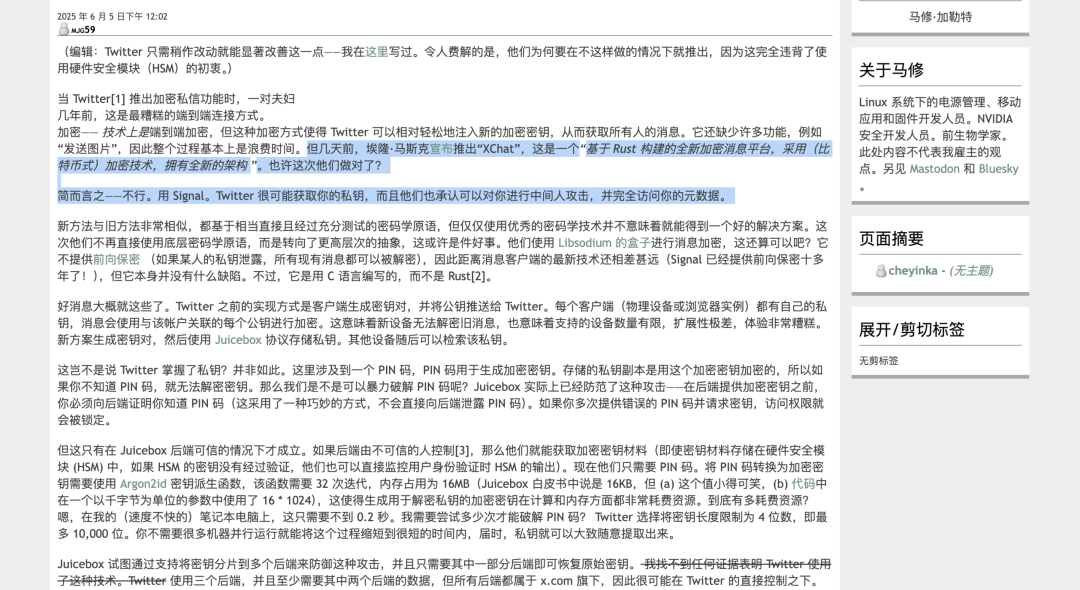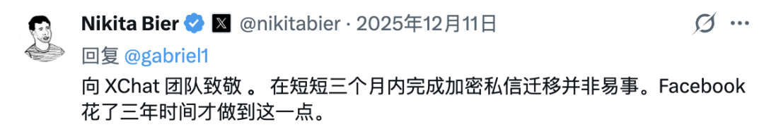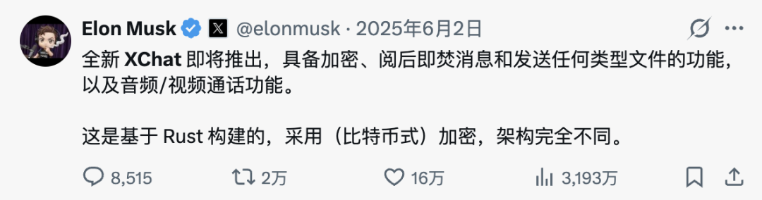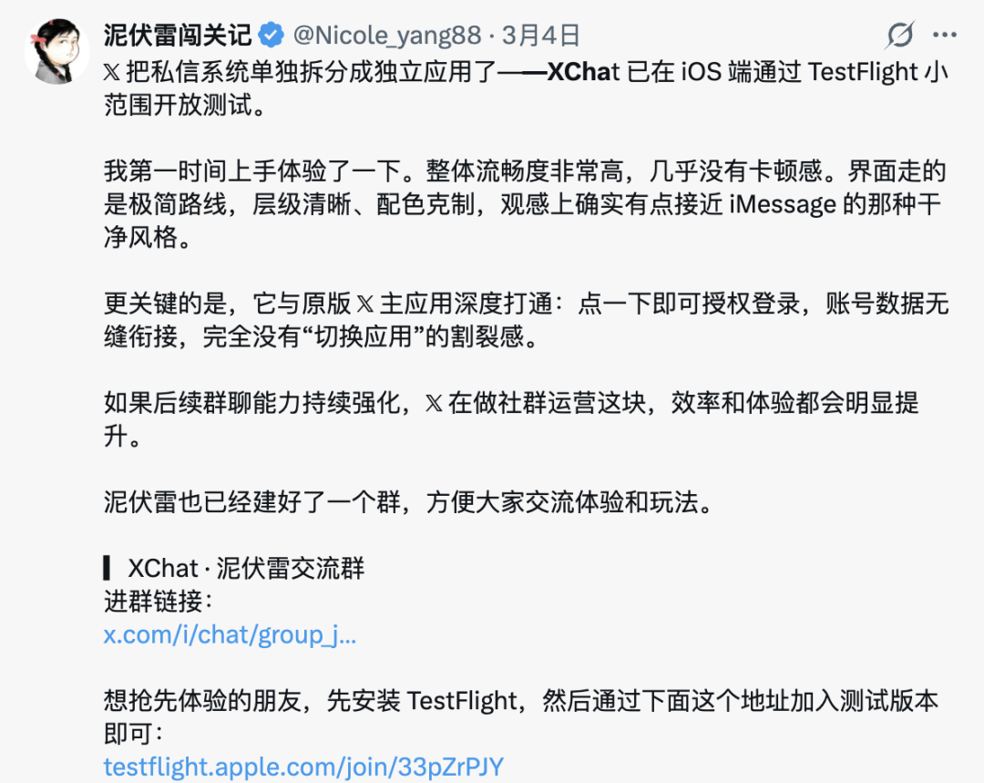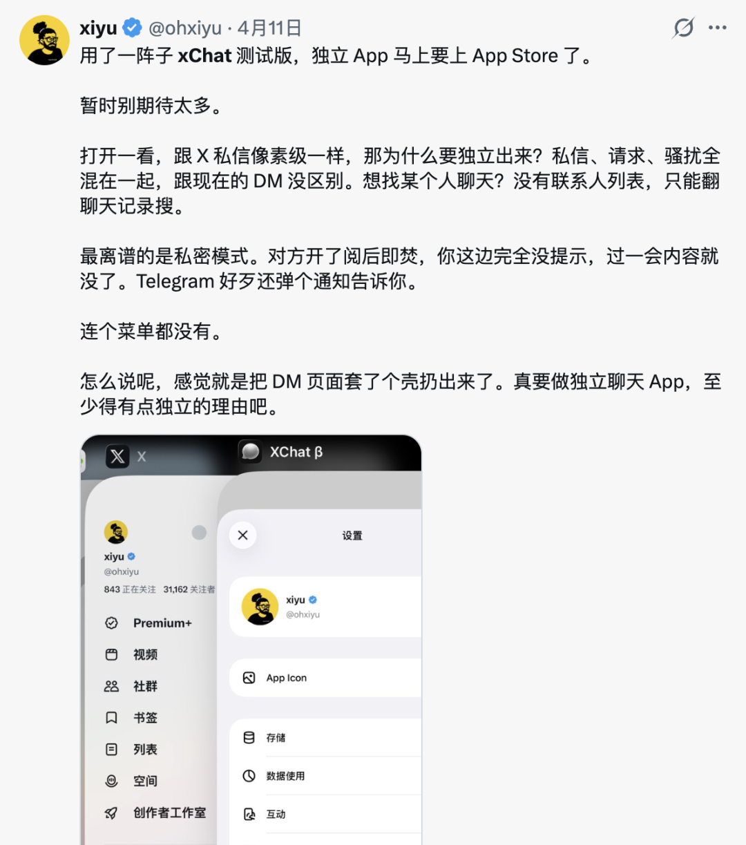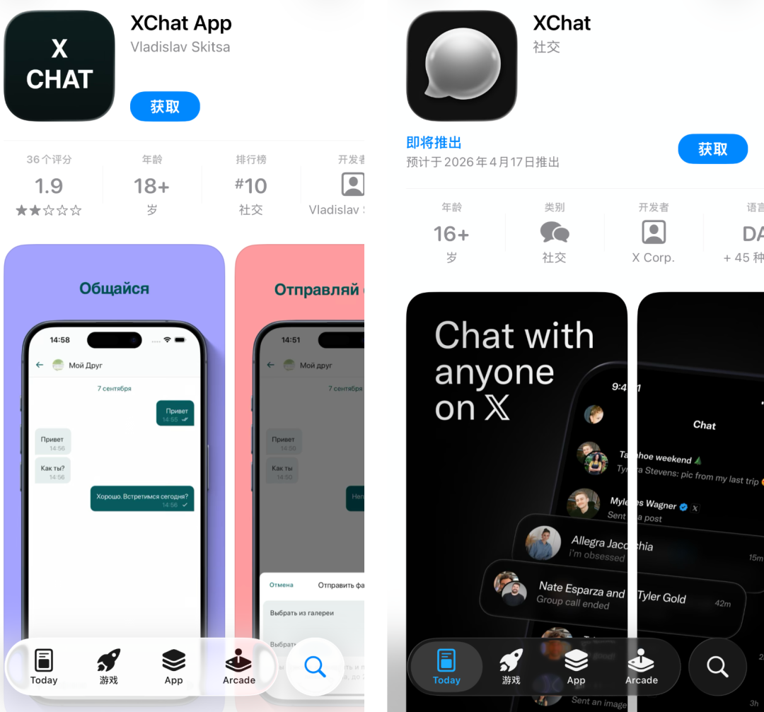 距离马斯克的「超级应用梦」落地,只剩最后三天。4 月 17 日,XChat 预计正式登陆苹果 App Store,全球同步开放下载。这绝对不是一次普通的 App 上架。在马斯克那张疯狂且庞大的商业战略棋盘上,XChat 是他豪掷 440 亿美元买下 Twitter、将其暴力更名为 X 之后,又一枚核心、也最不容有失的落子。收购 Twitter 之后,马斯克几乎在每个公开场合都会提到微信。他说:「在中国,你基本上是生活在微信里的,因为它对日常生活如此有用。如果我们能在 X 上实现这一点,哪怕只是接近,那都将是巨大的成功。」马斯克痴迷的不是微信的聊天界面,是它作为数字生活操作系统的地位,支付、通讯、打车、外卖、水电费,全在一个 App 里。如果说收购 Twitter 是拿到了超级应用这场赌局的入场券,那么 XChat,就是他在牌桌上打出的第一张明牌。顶着马斯克版微信的噱头,XChat 却活成了 Telegram 的模样?从功能上看,XChat 主打的是隐私优先的独立聊天应用。注册不需要手机号,直接用 X 账号登录,消息支持阅后即焚、撤回和编辑,群聊最多可容纳 481 人,文件传输上限高达 4GB,跨设备音视频通话全部内置,下载需要 iOS 26.0 或以上版本。应用层面禁止截图和录屏,试图从源头堵住内容泄露的漏洞,这可能是一些科技圈老板最喜欢的功能,Grok AI 被直接嵌入聊天界面,可以在对话里随时调用,用于总结内容、实时翻译或规划行程。XChat 的整体定位走的是干净、私密、少打扰的路线,界面剥离了 X 主应用里的信息流、广告和热搜,专门为私密对话留出空间。首发支持 46 种语言,包括简体中文和繁体中文。带着马斯克极其鲜明的个人烙印,XChat 不仅在定位上大刀阔斧,其项目推进速度更是快得惊人,甚至透出几分激进与狂热。去年 6 月,马斯克才在 X 上公开预告;到了 12 月,X 员工 Nikita Bier 就已经开始公开为其站台,惊叹团队「在短短三个月内完成加密私信迁移」,并顺脚踩了一下同行:「Facebook 花了三年时间才做到这一点。」今年 3 月,iOS 版 TestFlight 测试名额开放,先是 1000 人,很快扩到 5000 人,名额在公告发出后短短两小时内被抢光但伴随高关注度而来的,是极其两极分化的口碑。3 月就拿到 TestFlight 资格的用户 @Nicole_yang88 写道:「整体流畅度非常高,几乎没有卡顿感。界面走的是极简路线,层级清晰、配色克制,观感上确实有点接近 iMessage 的那种干净风格。」她还特别提到,与 X 主应用一键授权登录、账号数据无缝衔接,「完全没有切换应用的割裂感」。测试用户 @ohxiyu 发文:「打开一看,跟 X 私信像素级一样,那为什么要独立出来?私信、请求、骚扰全混在一起,跟现在的 DM 没区别。想找某个人聊天?没有联系人列表,只能翻聊天记录搜。」更让人摸不着头脑的是私密模式的设计,对方开了阅后即焚,你这边完全没有提示,内容过一会儿就消失了。他说:「Telegram 好歹还弹个通知告诉你。连个菜单都没有。感觉就是把 DM 页面套了个壳扔出来了。」甚至 XChat 还没正式开放下载,麻烦已经来了。4 月 11 日预约开放当天,就有用户发出警告:App Store 里同期出现了一款俄语版 XChat,图标和名字与真品高度相似,下载后会要求用户提供信用卡信息和 ID 证明年龄。右边才是正版,安全下载,目前唯一可信的路径是通过苹果海外版 App Store 官方搜索,认准开发商为 X Corp。🔗 https://apps.apple.com/us/app/xchat/id6760873038博主 @Imlaomao 亲身中招:「不小心输入信用卡信息后,觉得不对,立刻把信用卡都注销了。」他虽然表示没有直接证据证明该 App 一定存在问题,但建议大家「安全第一,小心为好」。一款把安全隐私刻在脑门上的应用,在发布首日就得靠用户自己去甄别李逵和李鬼。这个充满戏剧性的开局,很难说不是对 XChat 未来命运的一个隐喻。在 XChat 的所有宣传话术里,「比特币式加密(Bitcoin-style encryption)」无疑是最抓眼球的字眼。深谙流量密码的马斯克,用这个偏极客词汇,成功让无数人脑补出了一幅赛博朋克式的画面:聊天记录上链、去中心化存储。根据英伟达安全开发人员 Matthew Garrett 对 XChat 早期版本的技术分析,XChat 的消息加密层采用了 libsodium 的 box 加密方案。这套方案本身经过广泛审计,算得上扎实。但有一点马斯克没有说清楚:libsodium 的核心是 C 语言写的,X 调用的正是 C 语言版本,并非他对外宣称的「全新 Rust 架构」。