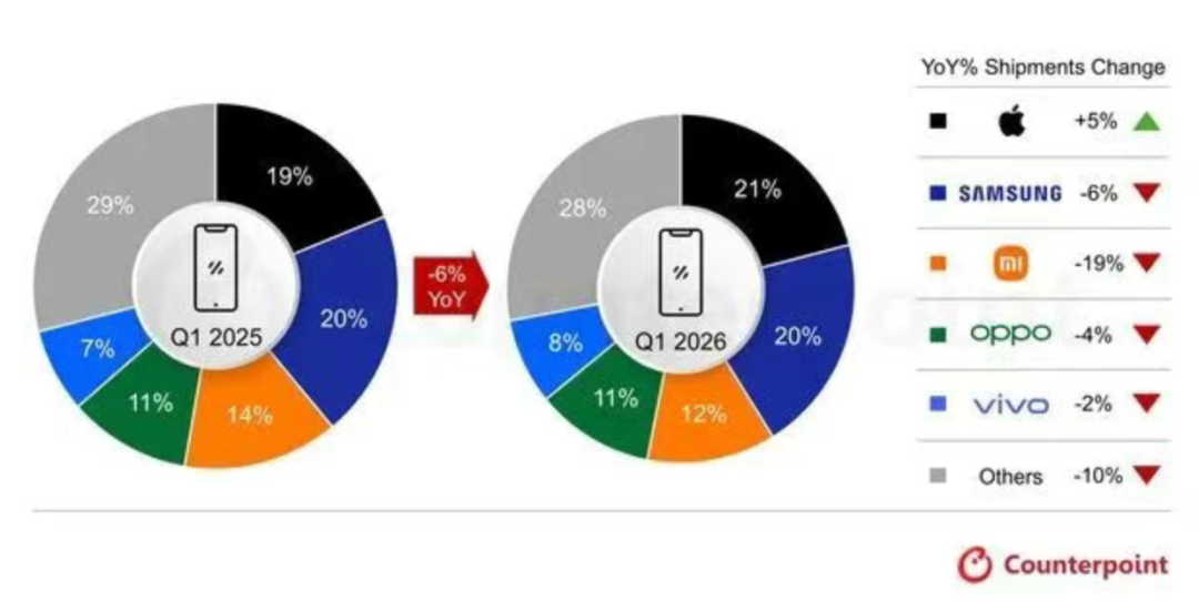 Counterpoint Research的监测数据显示,2026 年第一季度全球智能手机出货量同比下降 6%,连续多个季度处于收缩状态,行业尚未走出低迷周期。