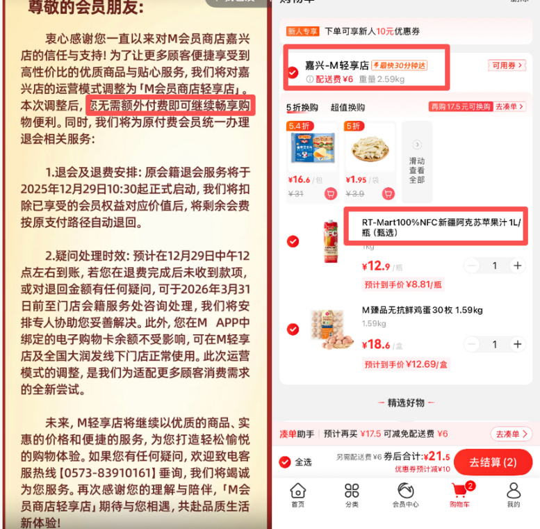 壹览商业发现,早在2025年12月,位于嘉兴的M会员商店就已率先完成改造,以“轻享店”的新形态亮相。这一新模式的核心变化包括:取消会员准入限制、配送业务交由“大润发优鲜”承接,并在卖场内引入部分大润发的自有商品。