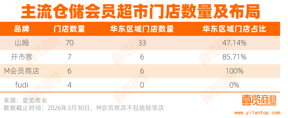 在竞争层面,以山姆为代表的国际成熟玩家正加速布局。以华东地区为例,据壹览商业不完全统计,截至2026年3月,山姆在全国共有70家门店,其中33家位于华东;开市客共有7家门店,其中6家位于华东。