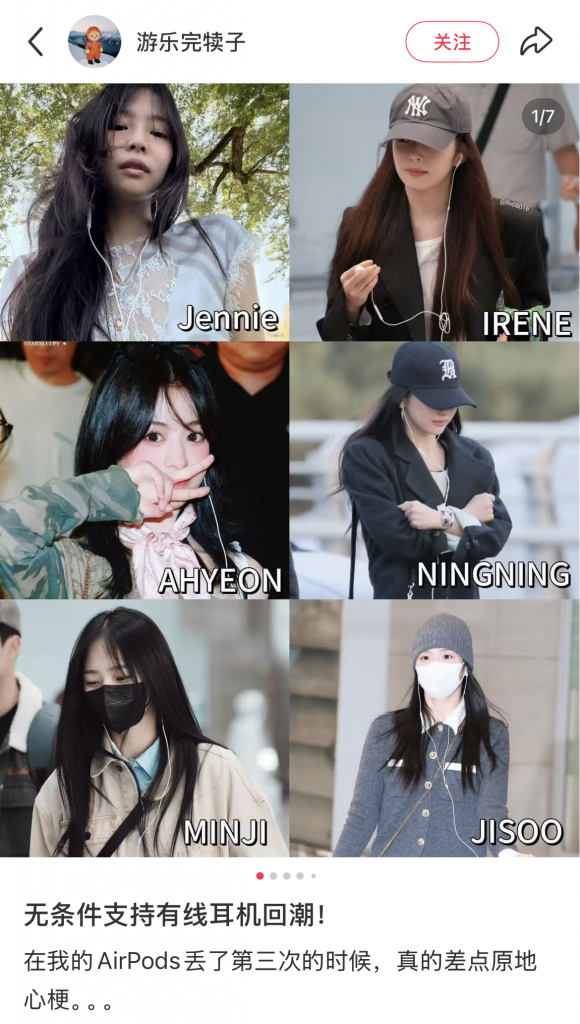 前两年韩国女爱豆们各种上下班和机场的街拍图,基本都被AirPods Max统治,这两年她们头上戴着的,一般是一副有线耳机。