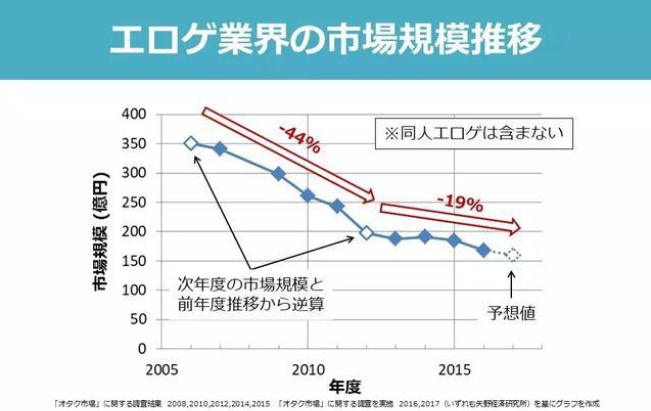 Galgame的黄金年代逐渐退场,成人游戏更是一蹶不振。根据日本矢野经济研究所在2016年的统计数据,从2005到2012七年间,日本成人游戏的市场规模缩小了44%;市场销售额从2003的560亿日元萎缩到2015年的150亿日元。