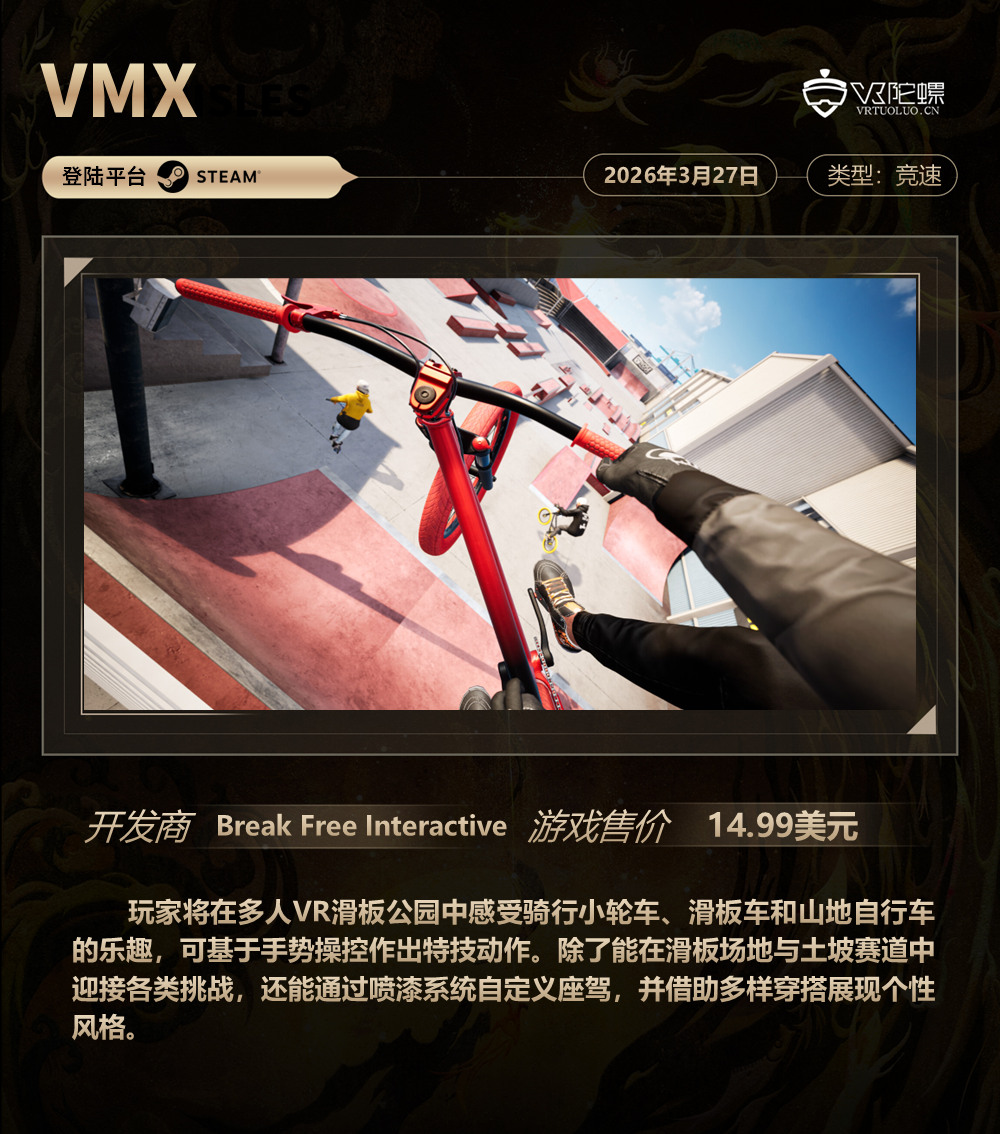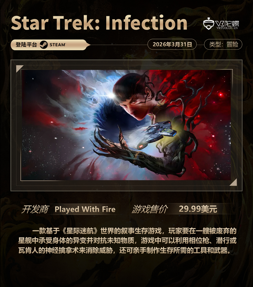 此外,《星际迷航》IP衍生游戏《Star Trek: Infection》已正式上线Steam及Meta Quest平台,该作带有一定恐怖色彩,并将生存与冒险游戏玩法与IP剧情相结合,喜欢《星际迷航》的粉丝不要错过。另外,一款极限运动模拟游戏《VMX》上线Steam平台并收获颇多好评,玩家可在游戏中安全体验小轮车、滑板车和山地车的乐趣。