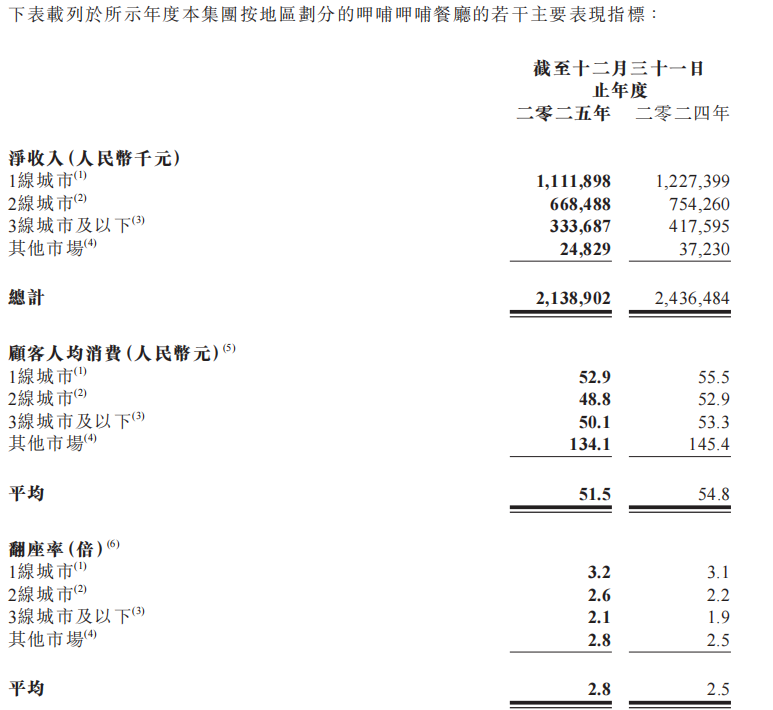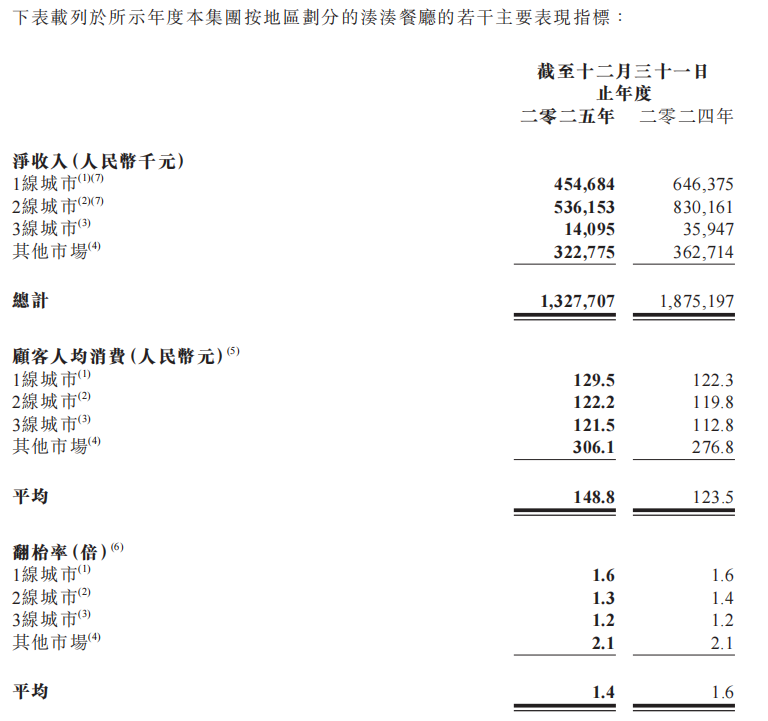 分品牌来看,呷哺呷哺业务收入由2024年的26.30亿元降至22.79亿元,同比减少13.3%;湊湊业务收入由2024年的19.48亿元降至13.49亿元,同比减少30.8%。