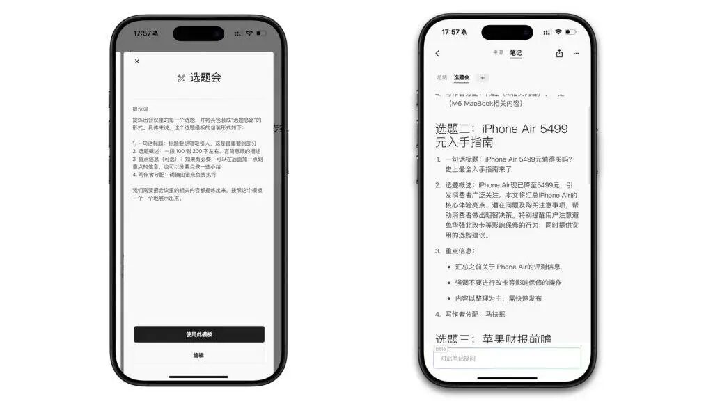 比如,我们每天早上都会开选题会,涉及到选题内容、选题核心、重点信息、负责编辑这些要点,普通转写能够记录,但很难成为一份能直接执行的东西。