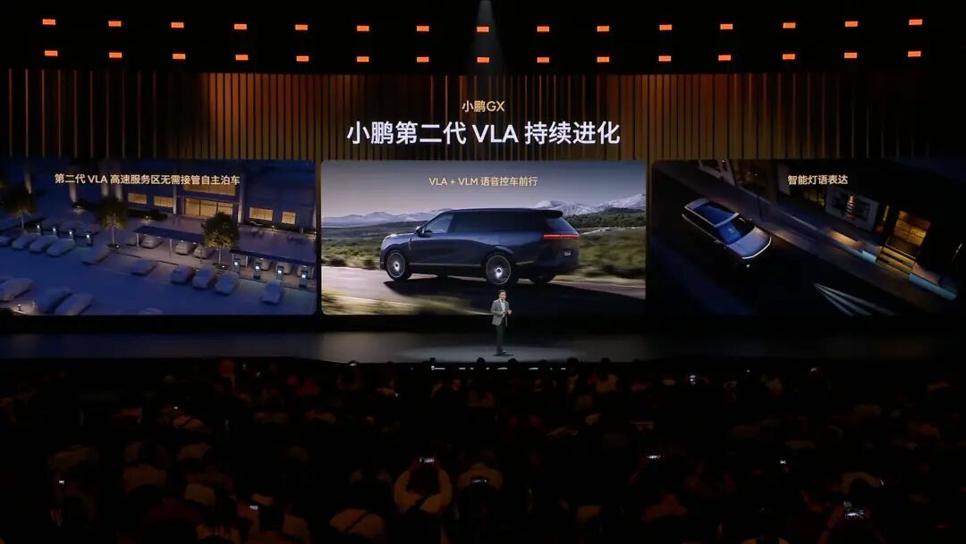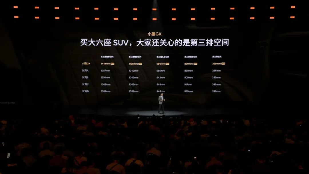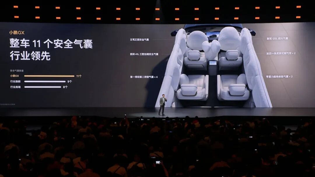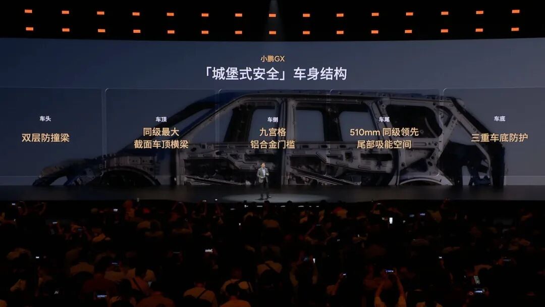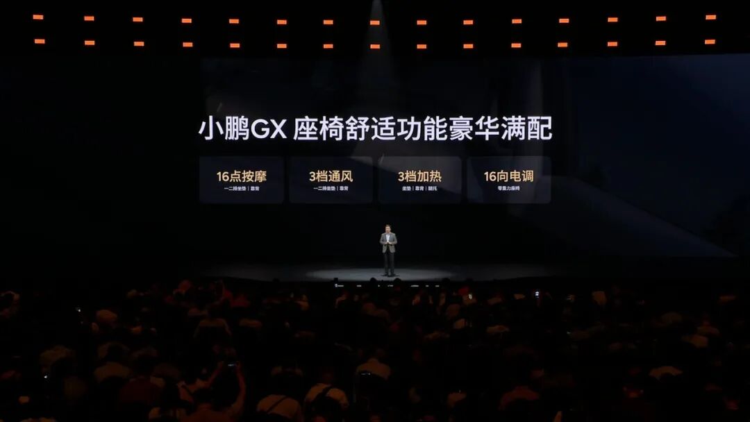在首款车型发布 8 年之后,小鹏终于迎来了一辆真正能对标业内「9」系的旗舰 SUV 。 何小鹏在今天发布会一开始就先解释了一个问题,为什么这辆车取名叫 GX?G 代表了伟大,强大,卓越的气场,以及它是一台真正的全尺寸的旗舰 SUV;而 X 代表一种探索,代表小鹏向上的探索科技无人区的一种勇气,以及领先一代的技术。因此这辆车除了在用料、配置上追求豪华之外,还是小鹏近些年技术积累的集大成者,线控底盘、图灵芯片、接近 Robotaxi 级别的智驾能力等都搭载到了这台 GX 上。当然,与此同时,小鹏 GX 的预售价也创下了有史以来的新高——39.98 万元。GX 延续了小鹏一贯的简洁科技感,展现出了全尺寸 SUV 应有的磅礴体量,其车身长宽高分别为 5265 毫米、1999 毫米和 1800 毫米,轴距达到了 3115 毫米 。为了削弱超大尺寸可能带来的笨重视觉感,设计团队从游艇造型中汲取了灵感,将修长的船舷线条融入了车身。侧面车窗区域,该车采用了隐藏式水切设计,将传统的窗框水切条收纳于车门内部,使得侧窗玻璃表面保持纯平无遮挡的状态 。其侧向车窗总面积达到 2.682 平方米,这种无遮挡的设计不仅优化了侧向视野,其平整的表面结合侧扰流板,还使得整车风阻有所降低。车辆的前后造型同样遵循了极致简化与一体化的思路。小鹏 GX 前部搭载了面积达 2.275 平方米的蚌式机舱盖,该机舱盖向侧面一直延伸至轮眉区域 。车尾部分同样采用了蚌式尾门设计,尾门向后侧围两侧延伸,与后翼子板结构相连接 。此外,为了凸显旗舰定位,小鹏 GX 在车头首次应用了太空陶瓷 24K 金标,该车标采用航天级氧化锆陶瓷与 PVD 真空镀金工艺,经过 33 天共 15 道工序的微米级 CNC 精雕而成。在外观色彩上,该车提供了珠峰白、天山黑、峡湾灰、丹霞红以及哑光质感的日照金山五种配色 。其中,哑光漆面采用了成本颇高的巴斯夫顶级哑光清漆与多层纳米结构涂层技术,并结合了恒温无尘环境下的 AI 机器人喷涂与局部人工打磨,成功复刻了雪峰的绒感金光。小鹏 GX 的车头配备了贯穿式日间行车灯,内部集成了 340 颗 LED 光源,并采用了多层光路设计 。车尾则布置了一条长度为 1.64 米的贯穿式尾灯,内置 380 颗 LED 光源。车辆的前大灯组搭载了华为 DLP 投影技术,系统能够实现 130 万像素的精准光线控制与遮蔽 。在夜间会车等驾驶场景下,大灯可以通过视觉算法远距离识别对向或同向车辆,并自动遮挡远光照射范围内的目标。在高速行驶状态下,这套投影大灯可以将实时的跟车距离以图像或数字形式投射在路面上作为安全预警 。此外,大灯还能在车辆进行自动变道、转弯或礼让行人时,将车辆的行驶意图以高达 2000 流明的亮度投射于地面,同时支持在停车状态下进行娱乐投影 。如果说小鹏 GX 此次的外观设计还称得上「中规中矩」甚至颇有亮点,那 GX 的内饰,尤其是金色版本,则显得有点匹配不上 40 万元的价格。仪表台、座椅、门板、顶衬几乎都压在同一套颜色里,主色和辅色没有拉开,深浅层次也不够,结果就是整个座舱的视觉重量被平均摊开了,车内该有的前后层次和重点区域都不够清楚。正常来讲,这个价位的车,内饰通常会通过颜色、材质,或者明暗变化,把「背景」和「前景」区分出来,哪些部分负责铺陈氛围,哪些部分负责形成视觉焦点,一般都会处理得更明确。GX 在这方面做得一塌糊涂,完全没有体现出旗舰车型该有的质感。从后排视角观察,会更容易发现问题。GX 整个仪表台的纵深显得有些单薄,高低起伏也不明显,导致前舱的体量感偏弱。17.3 英寸中控屏更像是被强行塞进了台面里。放在十几万级别的车上,这样处理可以理解,但是放在 GX 这种旗舰定位的车型上,就显得有点敷衍。还有一个细节,GX 门板上的氛围灯不仅布局很碎,边界处理得也不够干净,视觉观感非常松散,对比同价位一些做得更成熟的竞品,无论是线性灯带,还是边界清晰的轮廓式发光,都会更容易做出「见光不见灯」的高级感。总之 GX 的内饰很多地方都停在了「够用」上,离这个价位该有的设计感和精细度还有不少差距。不过,设计不行,还可以靠堆料来凑,小鹏在座舱配置上倒是毫不吝啬。首先小鹏 GX 的车内空间相当宽裕,车内垂向高度达到了 1311 毫米,并在第二排座椅之间预留了 180 毫米宽度的中央通道,以便于乘客进出第三排 。副驾驶位及第二排右侧均配备了零重力座椅,第二排左侧则为准零重力座椅 。这些座椅表面采用 NAPPA 真皮包裹,内置 16 点按摩模块,支持 14 向电动调节,并具备 3 档加热与通风功能,其中加热区域覆盖至电动腿托 。在前后排均有乘客乘坐的状态下,这些零重力座椅也能够独立进行倾倒展开 。第三排座椅具备电动调节功能,靠背和头枕可以实现 0 至 180 度的无极调节,直至完全放平状态,同时坐垫和靠背均配备了加热功能 。此外全车座椅内部均集成了 ABTS 与 PLP 双预紧双限力式安全带,坐垫下方设有防下潜气囊,并且座椅骨架带有机械式溃缩吸能机构,用以在发生碰撞时减轻乘员受力 。小鹏 GX 此次还在第二排和第三排的侧窗区域使用了总面积达 1.88 平方米的调光隐私玻璃 。该玻璃采用染料液晶(LC)技术,能够在 0.16 秒内完成明暗透光率的切换 。系统可以根据外部光照条件自动进行无级调光,例如在车辆驶出地下车库遭遇强光时自动调暗玻璃透光度 。在非隐私模式下,玻璃的雾度低于 4%,而在最暗状态