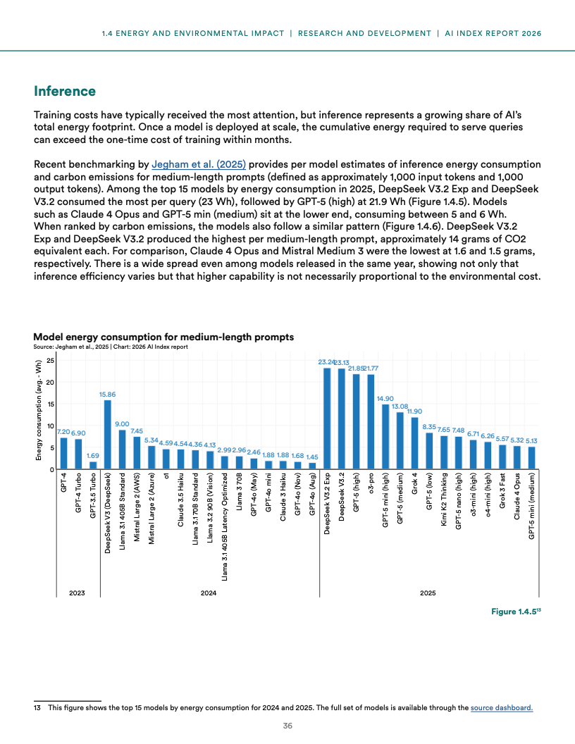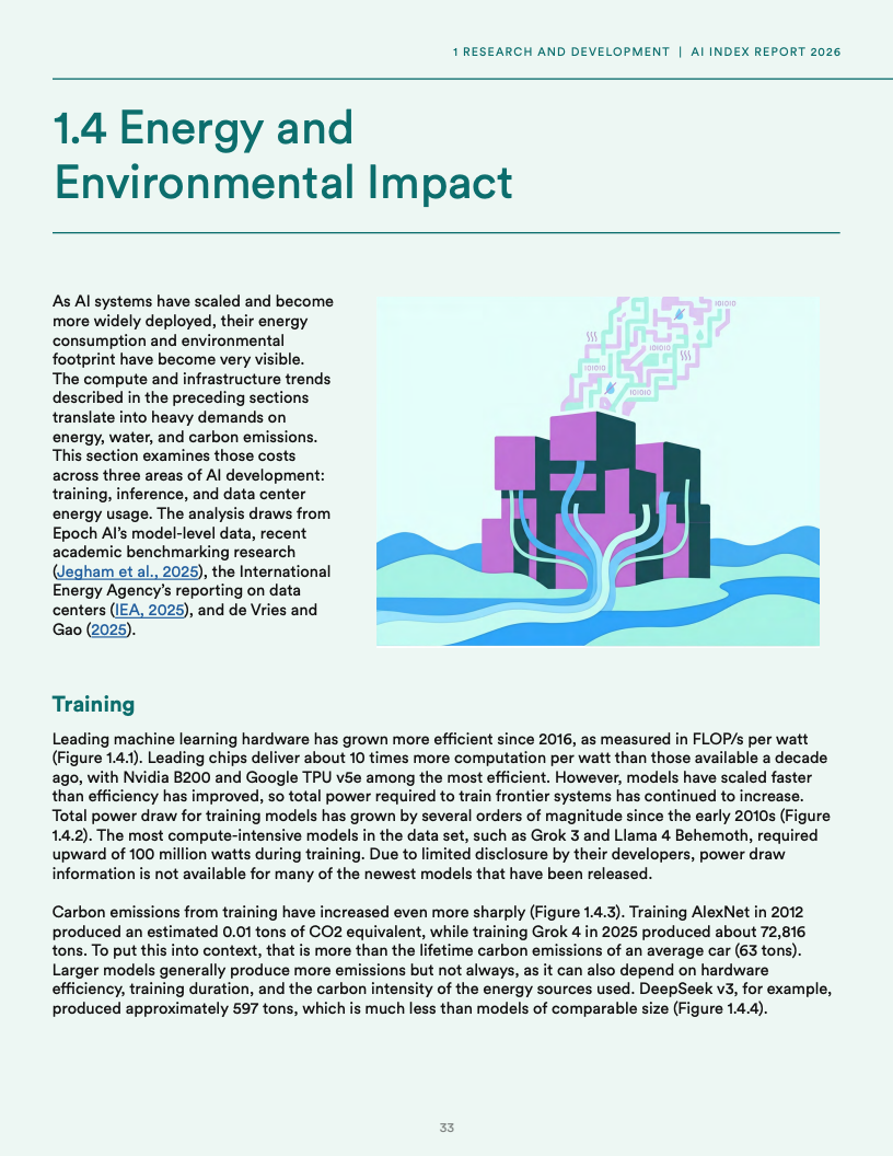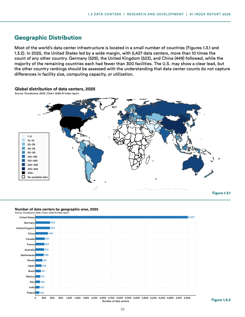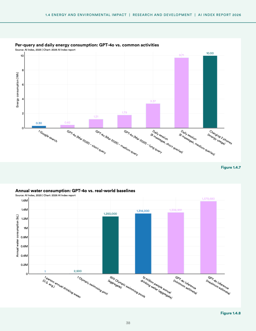 基础设施扩张带来显著资源约束,全球AI数据中心电力容量已达到29.6GW,接近纽约州峰值用电水平,同时单一模型训练碳排放可达7.28万吨二氧化碳当量,而推理阶段用水量已超过1200万人饮用水需求,表明AI发展正面临能源与环境的双重压力。