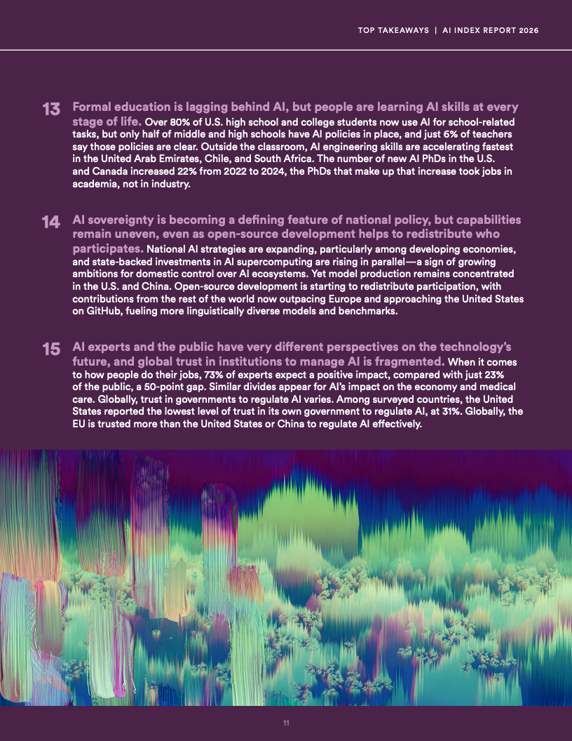 治理体系与社会认知明显滞后,2025年AI相关事故数量由233起上升至362起,而安全评估体系覆盖不足,同时公众与专家之间认知差距显著扩大,在就业影响问题上专家乐观比例为73%,而公众仅为23%,信任结构呈现分化趋势。