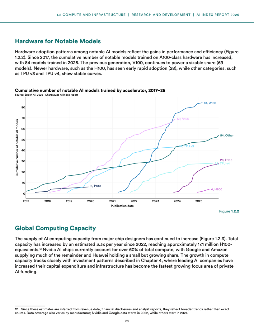 产业结构进一步向头部集中,2025年超过90%的重要AI模型由企业主导开发,同时全球算力规模自2022年以来以年均3.3倍速度增长至约1710万张H100等效算力,其中英伟达占比超过60%,且芯片制造高度依赖台积电,导致全球AI供应链呈现单点依赖风险。